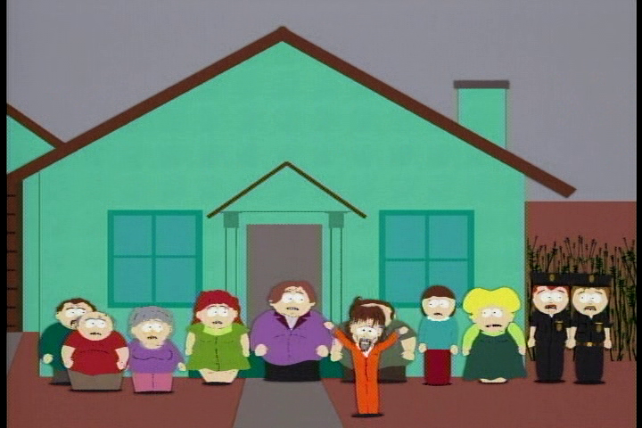 When Charlie and the boys get inside, the family is shocked to see Charles Manson. Howard emerges from the basement to more surprise and also sporting a shotgun. Everyone is fairly calm about the whole thing and Grandma is even happy to see her son. The cops form-up outside along with a news crew as they demand that Charlie Manson come out so they can shoot him. Another cop has to correct the one on the bullhorn that they won’t shoot him, or he’s just telling him to say that while they fully intend to shoot him. The Marsh family then arrives and Sharon marches right up to the cop with the horn and demands to know if this is the Cartman residence. When he tells her that it is, she grabs the bullhorn and starts screaming at Stanley. Everyone in the house looks at him nervously with the convicts even expressing some relief that they aren’t him right now. When Sharon finishes her tirade there’s a still frame of the exterior of the house and we hear Stan call meekly from inside “Sorry!”
