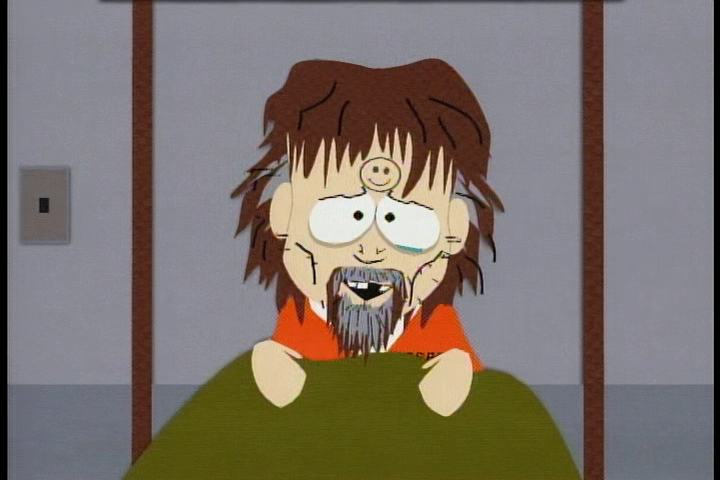 That night, we find the boys asleep in the basement. Kyle wakes up screaming and when the others ask what’s wrong he says he had a nightmare that he was trapped in a house full of Cartmans. When Stan tells him that he is trapped in a house full of Cartmans he resumes screaming. His screaming is interrupted by a crashing sound. Stan pinches Cartman to make sure he isn’t dreaming, then to be sure Kyle punches him in the face to doublecheck. Eric is getting pissed off and then Kenny punches him too. The boys soon realize they’re not alone and Eric turns on the light to find it’s Uncle Howard. He apparently busted out of prison which the boys think is pretty cool. He tells them not to let the rest of the family knows he’s there and informs them that they’ll be hanging out in the basement with them. When Eric asks who “they” refer to by asking if he has a turd in his pocket (a zinger he’s used before), his question is answered by another fellow entering through the window. He’s a haggard, bearded, man with a swastika carved into his head and a prisoner number of 06660. He introduces himself as Charlie Manson (Parker) and we get some thunder and lightning for dramatic effect.