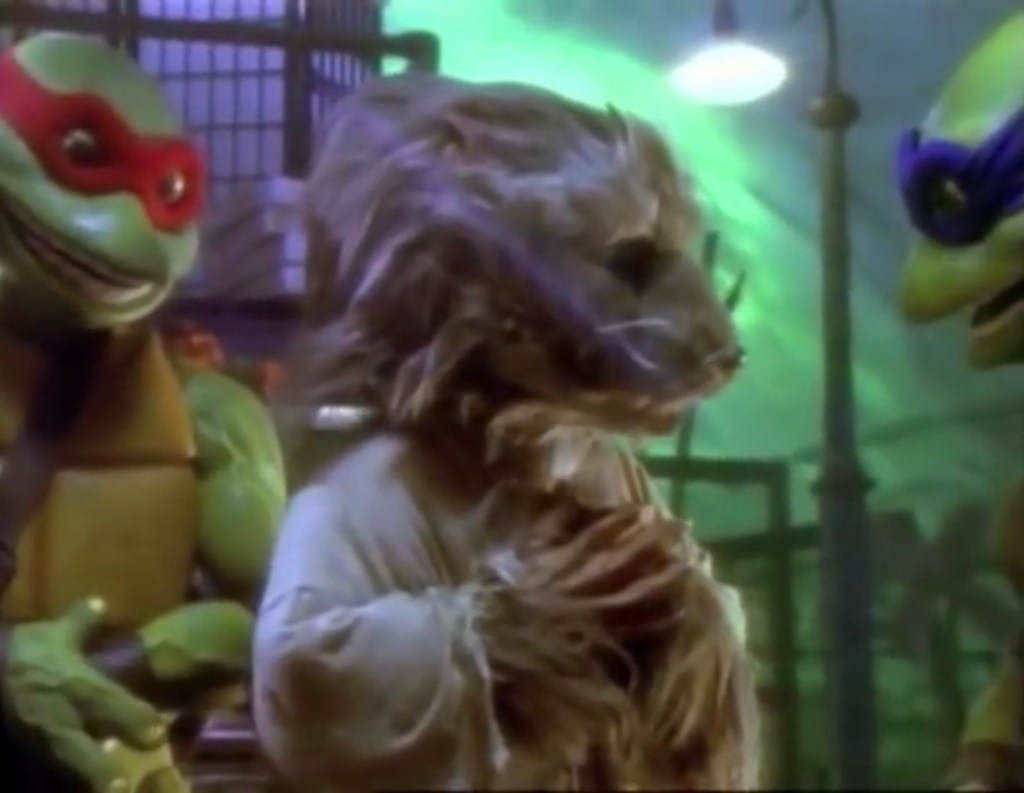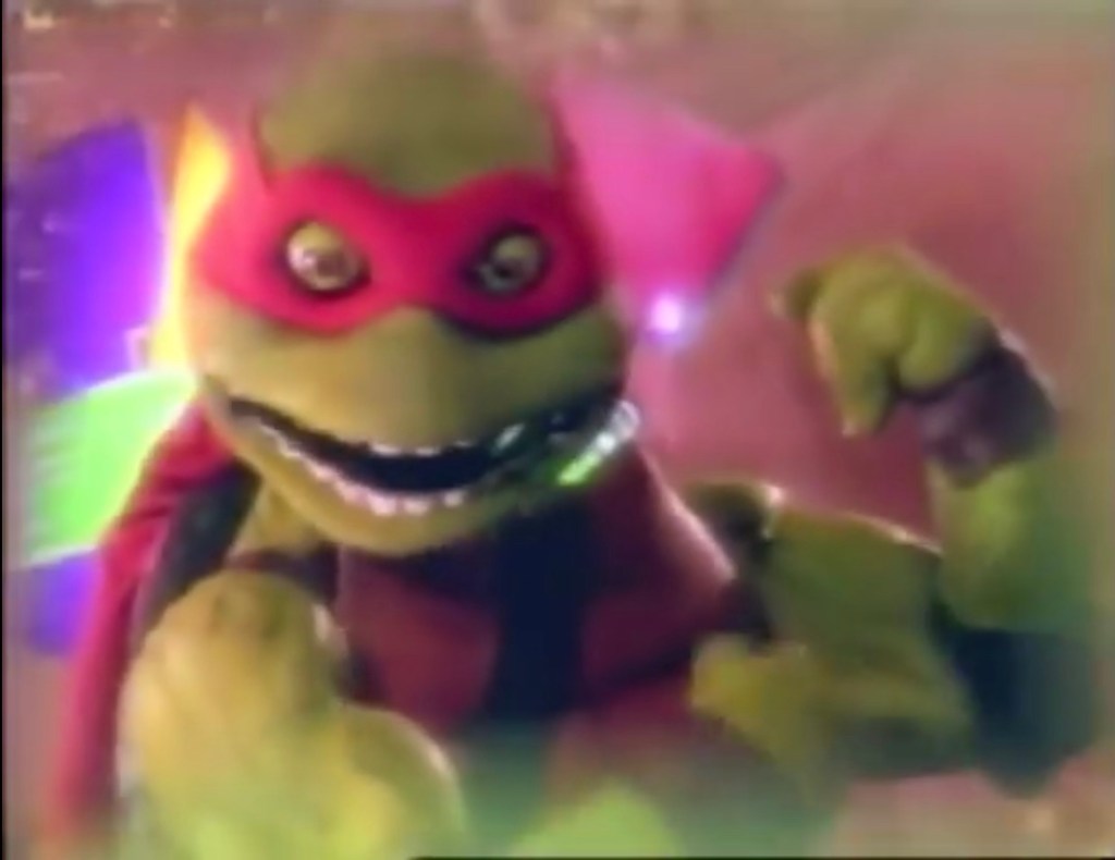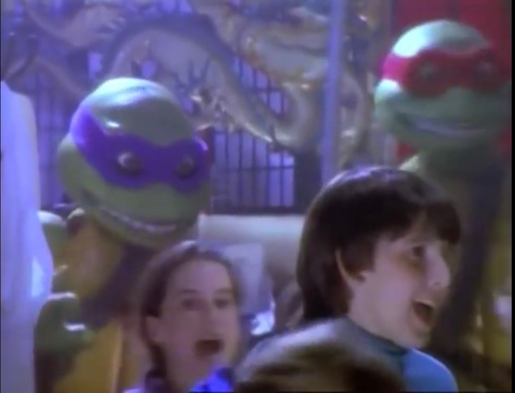 This thing begins with an intro in which a song plays over some cuts from later in the special. It’s edited together rather lazily as some shots will repeat during this thirty second bit. There’s almost no attempt to match the mouth movements of these hideous turtle costumes to the song either. These costumes are fucking terrible. They have no lips, and I suppose you may counter with the fact that you’ve never seen lips on a turtle, but by these costumes forgoing such a crucial piece of anatomy the result is when they sing it’s just teeth gnashing together. Their teeth are always exposed making these guys look rather deranged. There’s no attempt to create any sort of inside to their mouth either so when they open up it’s just blackness. Their heads are ginormous and for some reason the tails on their masks are about four feet long. Michelangelo (Alfredo Miller) is also wearing what I guess is a white scarf, but looks more like a strand of toilet paper. These costumes are so cheap you can see the straps for the shells going over their shoulders. And like the Coming Out of Their Shells turtles, they’re wearing sneakers. And for some reason Raph wants us to know they’re attractive.