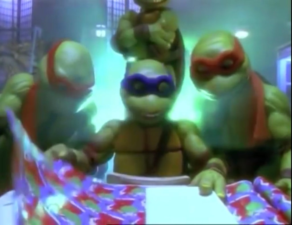 Splinter then tells his sons that they are generous in heart and soul, which you know is setting up some lecture. He tells them that their love is all he’ll ever need, which is what a parent says to their kid when they get a shitty gift. There’s some attempt at a message here, with thinking of those less fortunate, but the Turtles care not for that stuff. Instead, they want to sing their favorite song: “We Wish You a Turtle Christmas.”