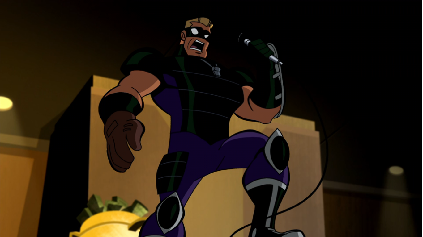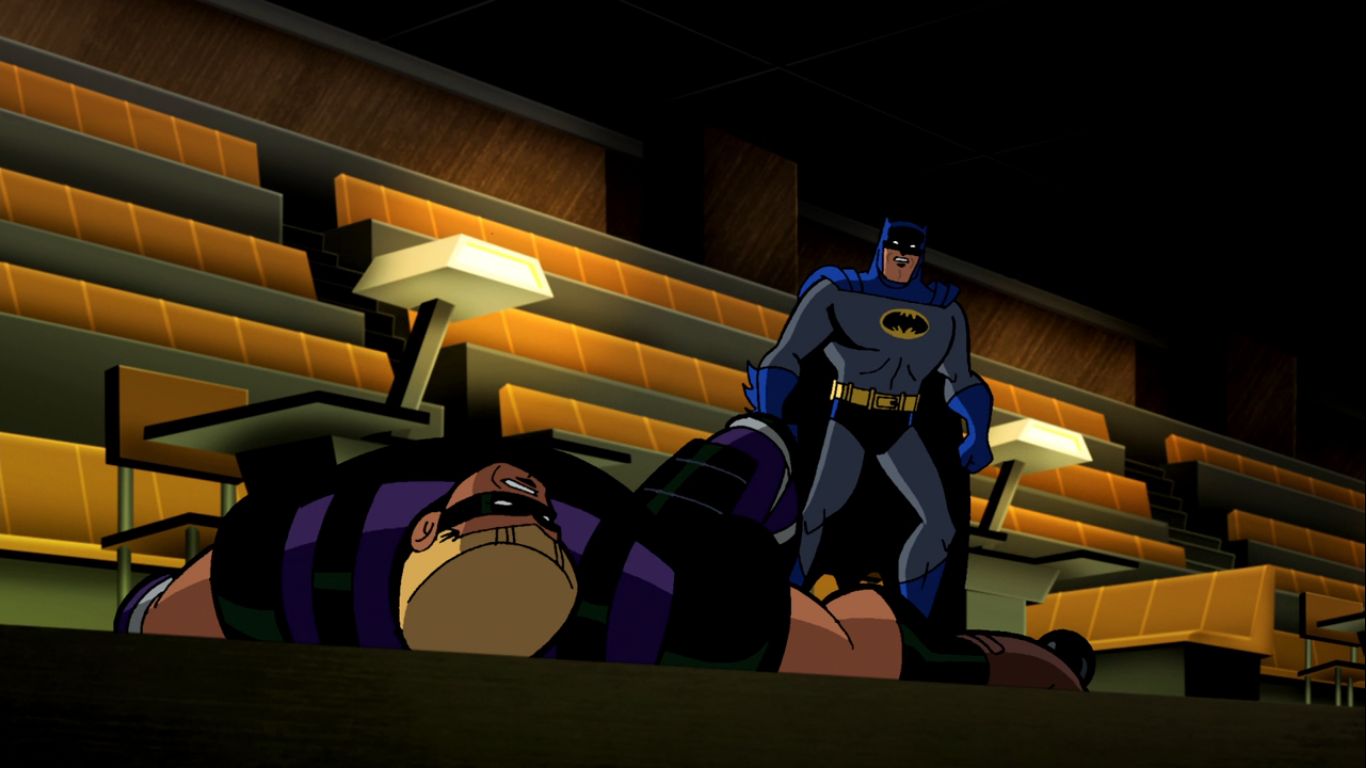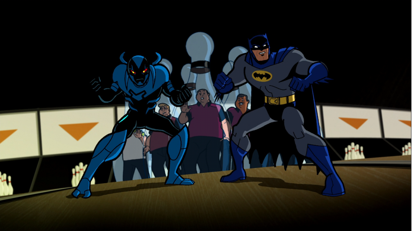 The way this show works, is it begins with a “teaser” that features Batman teamed up with a hero as they finish a job. It’s basically unrelated to the show’s main plot. And in this episode, we open with Batman (Bader) and Blue Beetle (voiced by former Batman Will Friedle) as they tangle with Sportsmaster (Tom Wilson)! It starts as a broadcast of The Professional Bowling League’s Christmas Tournament where the top bowlers in the country are competing for a sweet cash prize. Almost right away, Sportsmaster shows up to declare that bowling isn’t a real sport. Sportsmaster is basically a guy who has a costume composed of sports equipment. With him are a trio of goons one is a football player, one a baseball player, and the last is a hockey player. I’m not sure if he intends to steal anything or if he’s really out for money (he says he won’t steal their prize, but win it) or if this is more of a personal crusade against bowling. The bowlers don’t put up any sort of resistance apparently as we cut to them all placed in human-sized, transparent, bowling pins and the goons are setting them up. Sportsmaster then grabs a bowling ball, which is also a bomb, and rolls it in the direction of the pins. He’s a southpaw, in case you’re curious. Just before the ball strikes the pins a well-timed batarang intercepts it and detonates it before it can reach them. Enter Batman and The Blue Beetle!