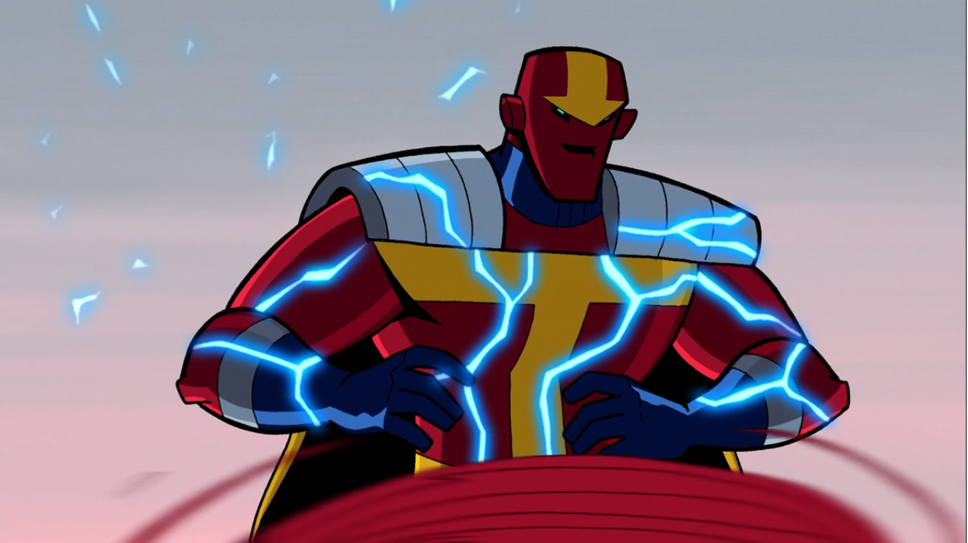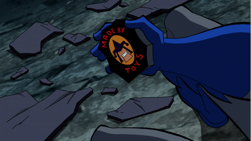 With the saucers now obliterated, the two return to the ground. Batman’s jetpack just sort of magically turns back into a cape. It makes no sense, but it looks pretty cool, and this is a cartoon about superheroes battling flying saucers so I’ll allow it. Batman examines the debris and finds a marking on it indicating it’s a toy. Red Tornado suggests he can search his database for the logo, but Batman tells him he won’t find it. Red Tornado comes back to say he could not locate it’s source, which seems to irritate Batman since he already told him he won’t. This logo is actually a mark of today’s villain. A flying saucer flies into view and from it emerges Fun Haus (Gary Anthony Williams)!