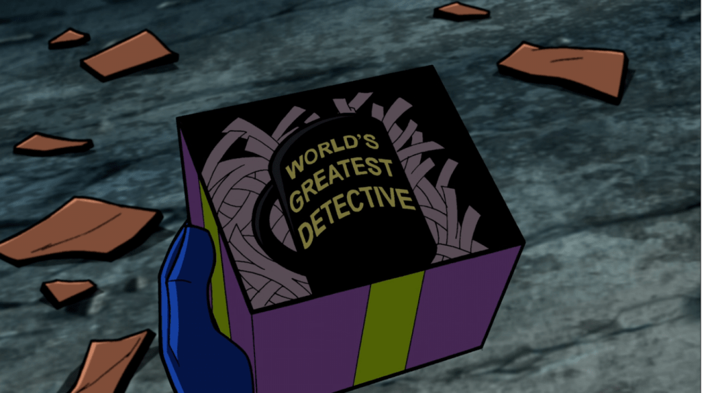 Red Tornado then declares that they cannot let Fun Haus ruin Christmas. Batman sort of corrects him by saying Fun Haus is a crook first implying they just need to stop whatever scheme he’s up to. Christmas is apparently of little concern to Batman. He then asks, “Besides, why do you care?” in response to Red Tornado’s apparent concern about Christmas. Red Tornado then confesses it’s because he lacks Christmas Spirit and it’s something he would like to experience. Batman retorts that it’s overrated forcing Red Tornado to observe that he is not the only one lacking in Christmas Spirit. He then hypothesizes that something will help the both of them and produces a gift for Batman. He responds with “You shouldn’t have,” and I get the sense that he means that sincerely. He opens it anyway and finds a black coffee mug with the words “World’s Greatest Detective” printed on it.