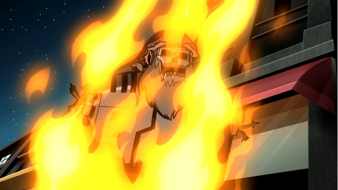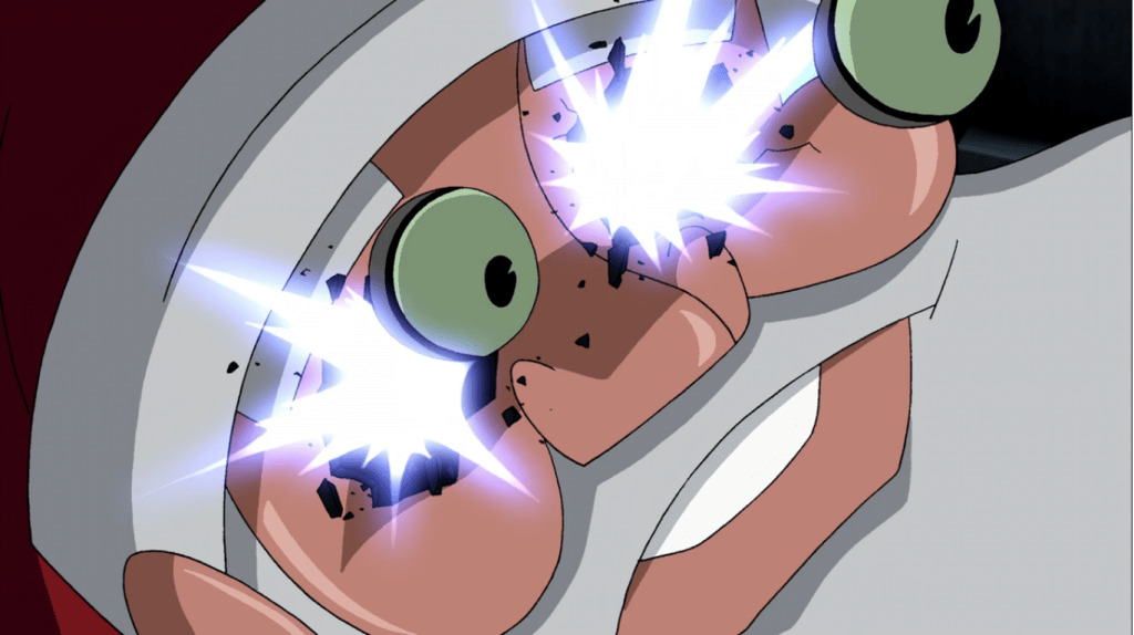 As he says that line, Batman spies a Santa stumbling through people on the sidewalk and the two head down to get a closer look. Batman accuses him of sipping too much eggnog, but we the audience recognize this Santa as the same robot one from just a moment earlier. His face is frozen in a smile and the “Ho ho ho” emerges from it same as before. Santa then dispatches the two heroes with a double uppercut, much to their surprise. From their backsides, Batman informs this imposter Claus that he just made the naughty list, while Red Tornado makes the useful observation that Santa does not typically behave in this manner. Batman points out that’s because this guy isn’t Santa. As the robot turns its attention towards the many pedestrians in the street, Batman nails him through the chest with a Batarang. The robot goes through a surprisingly gratuitous death scene that includes a close-up of its eyes bulging out of its head and exploding before the whole thing catches fire. Like a Terminator, this thing has a pretty detailed endoskeleton which stands in the middle of the street for a moment as all of the “flesh” is burned away before falling into a heap of Santa bones on the ground. I thought this show was for little kids?!