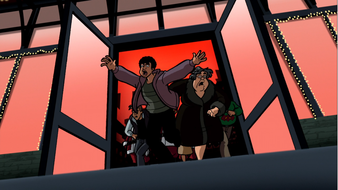Batman and Red Tornado approach the remains to inspect it, when the sound of more Santa laughter causes them to whirl around. An army of these things are waiting for them and the head on the apparent lead Claus pops open to reveal a monitor with an expected face to follow. Fun Haus then makes the same observation as me by sarcastically stating “Gee, that won’t give kids nightmares,” as he taunts Batman and Red Tornado from the safety of his base, or wherever he is. The Santas then attack and Batman and Red Tornado brawl with them in the streets. The same screaming woman we got a close-up of earlier gets another chance to shine screaming just as she did before. These Santas seem like they’re here to just be bad guys as one walks over to a little girl and snatches her teddy bear so it can rip it in half. They don’t seem that interested in just hurting people. Some people are also shown running from a department store and the character model for one of the ladies running out appears to be a direct homage to “Christmas with the Joker” as she looks pretty much exactly like the older woman a kid returns a purse to when Batman and Robin are on patrol. A fun little Easter egg for those who have been watching Batman cartoons for a long time.
