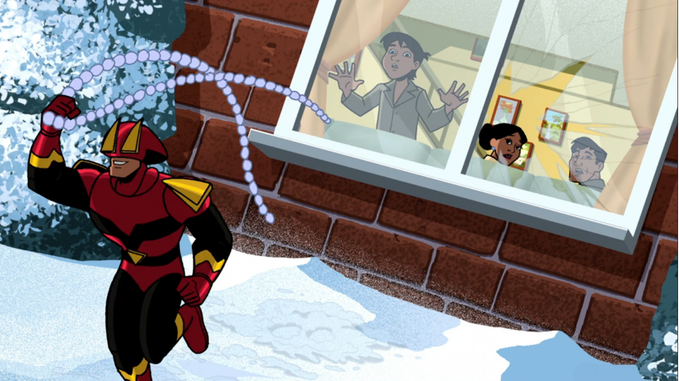 The sound of a runaway box truck gets the professor’s attention. He apparently has a super sense of hearing to notice the out of control vehicle and excuses himself from class for a moment. Once the door is shut behind him, he rips off his whole face to reveal a robotic one underneath. This, ladies and gentlemen, is Red Tornado! He whirls into action to save two children about to be struck by this vehicle, which comes to a complete stop shortly after, and delivers them to their father. There he tells the old man that his children need to be more mindful of traffic and he receives no objections from the man and his two kids. They thank him for saving them and for all that he does and make a reference to The Christmas Spirit in doing so. Red Tornado responds with, “Christmas…spirit?” as he’s apparently unfamiliar with the term. The boy (Zachary Gordon) describes it as a tingling feeling you get inside and when Red Tornado confesses he’s unfamiliar with that emotion the little girl (Liliana Mumy) laughs at him like he’s an idiot – “Of course you can’t, you’re a robot!” The three all have a hearty laugh while Red Tornado looks legitimately hurt.