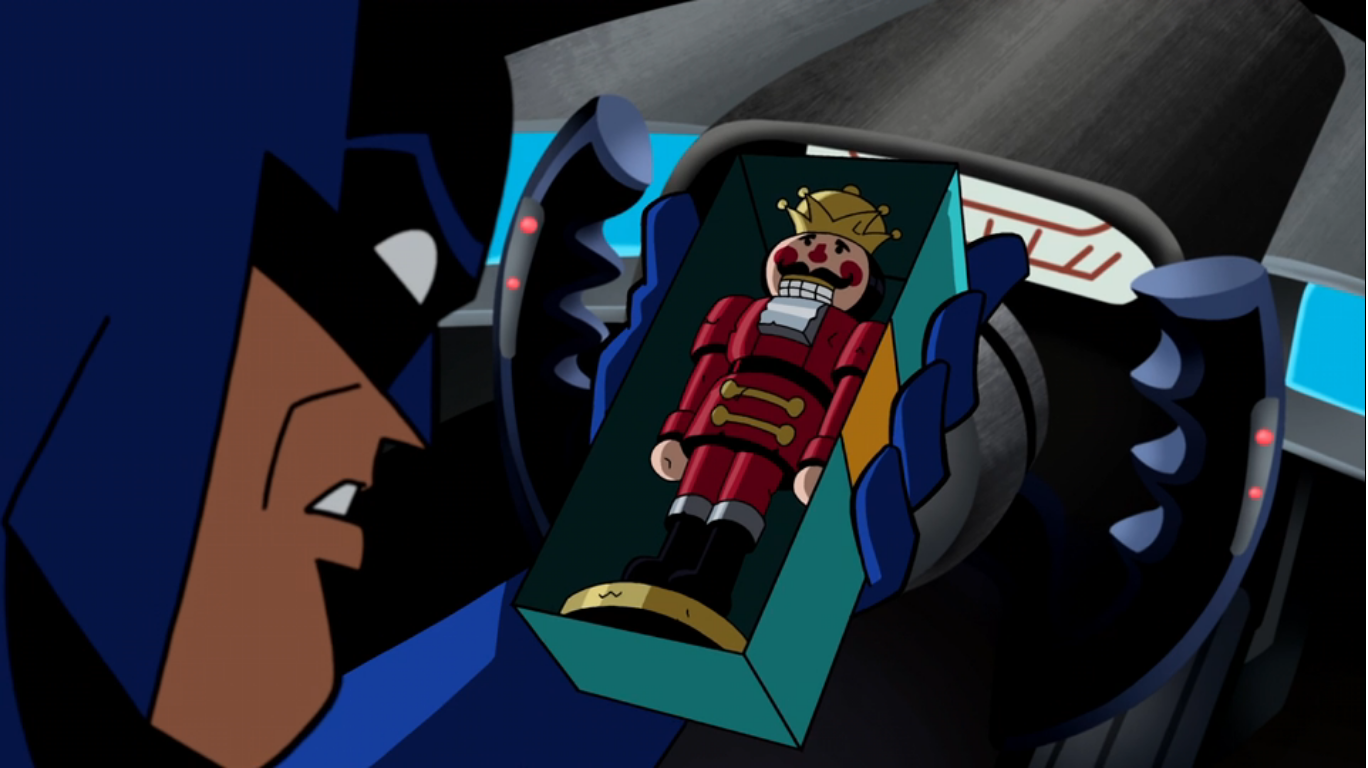 As the truck pulls away, the Batmobile comes speeding over. Batman hops in and is startled to see a present on the passenger seat. He opens it to find the old nutcracker from his flashback has been put back together. It’s a little rough looking, but looks pretty good considering what happened to it. Batman smiles warmly and we hear him think to himself, “Merry Christmas to you too, Alfred,” implying that his loyal butler re-assembled the toy and placed it in the Batmobile before he left the previous night. The dashboard then starts beeping and Batman’s face hardens as we hear him declare (in his head) “But crime doesn’t take a holiday, and neither do I!” He steps on the gas and the Batmobile goes speeding off towards the source of the beeping and it would appear that there will be no rest for Batman this Christmas.