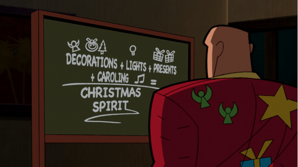 Back at his home, we find the professor working out an equation on a chalkboard. He seems to hypothesize that decorations plus lights plus presents plus caroling equals Christmas Spirit. Or he’s dividing by Christmas Spirit. My algebra teacher would have scolded me for writing an equation like this. Nonetheless, it would seem he can’t figure out why he has yet to feel this so-called Christmas Spirit given that he’s done what he feels is required. The television is on in the background and a black and white movie is on where a father asks his son if he’d like to know the true meaning of Christmas? Red Tornado responds out loud with, “Yes, please elaborate,” only for the movie to be interrupted by a news broadcast. Flying saucers are attacking the city and there’s a transmission from a Neptunian Leader (Friedle) demanding that Earth hand over the one known as Santa Claus. The anchor then informs us that Batman is on the scene and alone in defending Earth from these alien invaders. Not for long as the professor dawns his Red Tornado guise intent on joining the fray.
