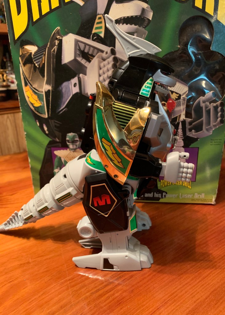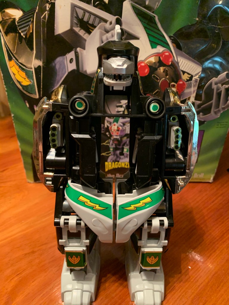The Dragonzord stands at approximately 9″ in height. It’s a little fungible as this is one of those characters intended to stand with its legs bent, but 9″ is close enough. The tail is around the same length as the heigh of the figure so this guy takes up a lot of real estate on a shelf. In terms of likeness to the show, there’s good and bad here. There’s quite a bit of paint and the parts that should be shiny are, and the ones that should be more matte are as well. There are spots here and there where it could be better. The red lights on the chest are slightly off and there’s some scuff marks in various spots on my figure. They’re things only apparent when handling the figure and not the type of thing that will show on a shelf. The painted patterns on the figure match the show as opposed to the vintage Bandai figure which basically did its own thing when it came to decals. I like the big, chunky, feet on this guy and the segmented tail with drill tip. There aren’t any missing paint apps that I can see, which wasn’t the case with the Tyrannosaurus zord.