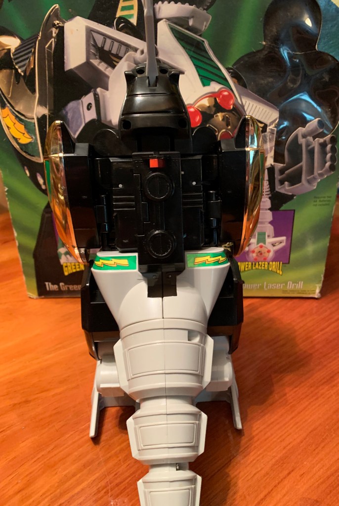 Below the waist there isn’t a whole lot to speak of. The legs connect via big hinged ball pegs. They can kick out to the side a little bit, but there’s basically no forward and back range. The thigh twist there works okay though and below that is another hinged peg for the knee. The range on that hinge is maybe 25 degrees, it’s basically just enough to give the figure that crouched stance. You can rotate there, though it’s more like a pivot. The ankles work okay though as they hinge forward and back a reasonable amount and there is an ankle rocker. For the tail, we get a segmented approach just the like the Tyrannosaurus zord before it. I think it’s a bunch of hinged pegs so you get some play throughout. It’s not as robust as a bendy tail, but it at least looks good. It’s just not terribly functional. The drill tip at least rotates.