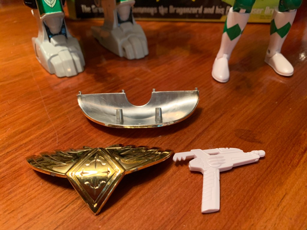 The Dragonzord isn’t a character that really cries out for accessories, but it does come with a few. Mainly, they’re alternate hands. The figure comes with open hands, but it also has a set of fists, flat hands with the missiles poking out of the fingers, and the missile firing effect hands. The open hands are the only ones with horizontal hinges while the rest have vertical ones, which is fine. I’m not sure the fists needed vertical hinges, but I don’t think it really matters. The red tips on the missile-ready hands could be better, but they’re fine. The effect hands are probably the ones most are likely to use because they are pretty damn fun. It looks like the smoke trails are done with translucent, yellow, plastic that’s been airbrushed. The only other accessories is a tiny, in-scale, Green Ranger playing his flute and an actual power coin with the Dragonzord logo on one side and the zord symbol on the reverse. The little Green Ranger is okay, the painted shield makes it looks better than the Red Ranger that came with the Tyrannosaurus zord, but it’s nothing special. The coin is what it is. As far as novelty coins go, it’s well done, but I don’t know that it’s really necessary. On the other hand, we’re not missing anything. Maybe some arms that could swap in that are angled so it can fake some better range there?
