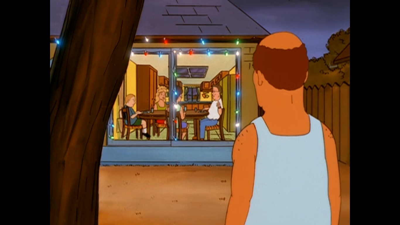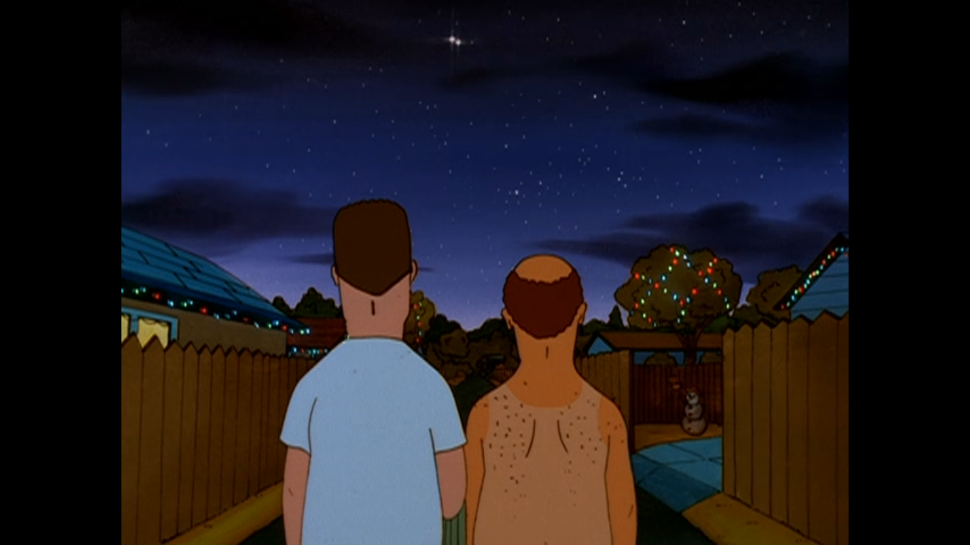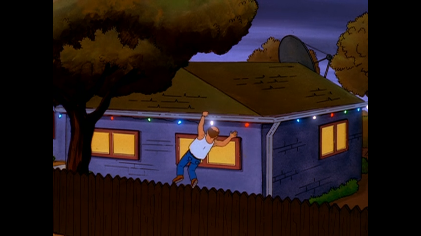 Bill says nothing, just removes the dress and shoes he’s been wearing. He must have been practicing to be able to walk so well in those heals. Standing in his shorts, Bill remarks to Hank that he hit rock-bottom there. Hank just confirms that he did and Bill responds that there’s no where else to go but up. Hank agrees and wishes his friend a “Merry Christmas” as the two turn to look at the stars. The camera repositions in front of the two who are just smiling as they look at the neighborhood all covered in Christmas lights. In the background, we see Dale emerge from his house in a purple dress. He sees that Hank and Bill have ditched their own and quickly turns around before the two spot him.