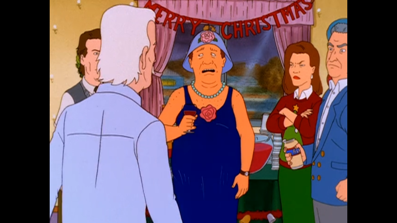 And so ends a Christmas special unlike any I can think of. It’s a pretty complex plot as we go from the uncomfortable reality that is supporting Bill around the holidays, to suicidal Bill, to Bill as Lenore, and ultimately a resolution. I said upfront that it wasn’t the most festive Christmas episode out there, but it never lets the holiday become irrelevant to the plot. It’s always there in the background and we even get to see some festive attire on the main cast during the party scene. I find it amusing that the first Christmas episode of King of Hill involved Hank losing his sight due to mental trauma and here in the second it’s Bill losing his sense of self and becoming his ex. That is, if you believe him. I think the show is pretty clear that Bill knows what he’s doing the whole time. He’s probably more in control than he lets on, but at the same time, he’s also out of answers and willing to try something drastic in order to cling to the memory of his wife.