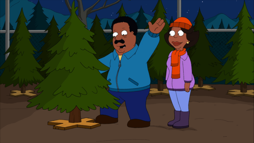Back at the house, everyone is outside putting up the decorations. Peter announces it’s time to put out the 2020 version of their decorations and then begins listing off the figurines he’s placing in a manger scene: ethnically accurate baby Jesus, Father Mary, Mother Josephine, the three genderless wise people on their scooters, Tig Notaro (for some reason), and the Little Drummer Them. He then adds, “Because, God forbid, we call a boy a boy.” Chris tries to confront his dad on his apparent transphobia and he erupts shouting “I don’t like what the world is! I’m white! When’s it going to be our turn?!” This does feel pretty authentic for the Peter character. Brian tries to calm him down, but Peter doesn’t see how that’s possible without “the woman who normally takes care of all of this.” He either doesn’t appreciate Lois to the point where he can’t remember her name, or he’s so mad at her that he doesn’t even want to address her by her name. Both seem plausible. Brian asks if he means Lois and he just refers to her as the redhead with the voice. He then starts tossing decorations over his shoulder as he goes through them remarking how she would put them up until one of the kids points out that he did it.