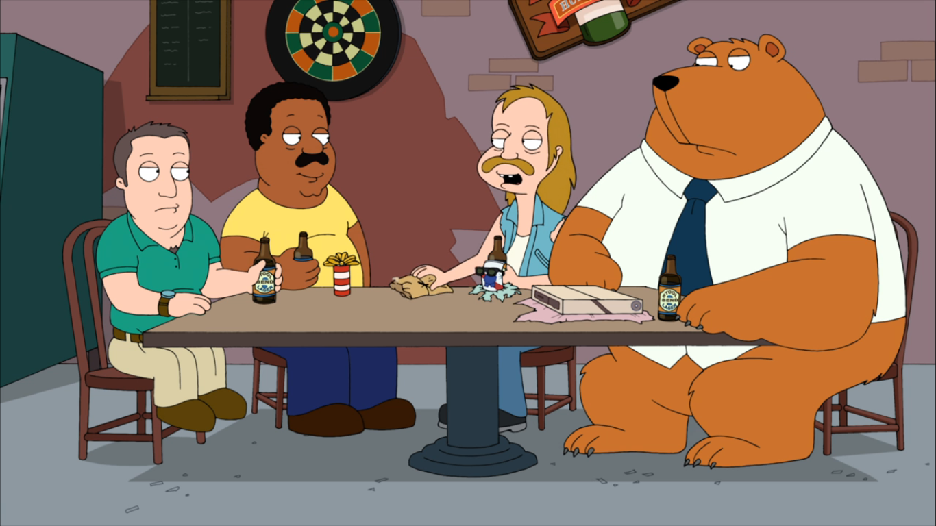 We’re not done yet! We return to the Griffin house and everyone is seated in the living room by a replaced Christmas tree. Peter says he’s glad to have Lois back so he doesn’t have to keep doing dishes and buying groceries, much to her annoyance since it was Lois who did those things. The family then challenges her on her alibi and asks her to come up with names for the cousins she was supposedly visiting the whole time. Predictably, she hastily comes up with the same names Quagmire did earlier: Bloofus and Klunt. She even says she thinks she hears them upstairs. She runs upstairs and we stay with the rest of the family as they listen in on Lois narrating the carnage being spread by Bloofus and Klunt. She smashes a diorama Meg made which was due the next day and also Stewie’s aquarium containing the fish you have to feed so damn much and they die anyway. Stewie is apparently buying this charade as he remarks, “Fricken’ Klunt, man.” She then gets to Peter and his discreet box of pills. He races upstairs, but can’t beat “Bloofus” to the toilet who flushes them away.