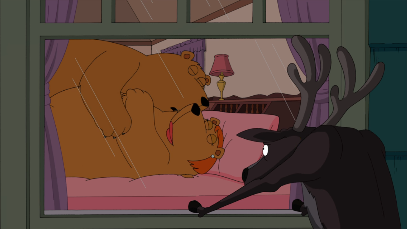 The family turns to look at the house and the decorations are shown to have miraculously landed precisely where they were supposed to. Peter declares it perfect as the whole family basks in the festive glow of the holiday display. His cell phone then goes off and it’s Quagmire. He requests Peter dim the lights because he’s presently in bed “with a three and light isn’t doing her any favors.” We then cut to Lois in shock as she views the family’s accomplishment. She is then interrupted as the letter H from earlier mistakenly enters her room with his side piece, M. He sees Lois and then apologizes adding, “We’re excited because my wife just killed herself.” Why are we returning to this joke?