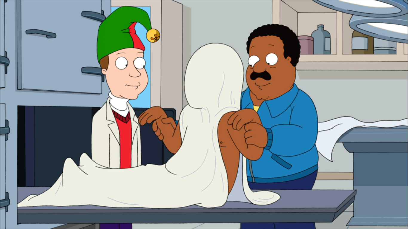 Lois is moved to tears and finally opens the gift to find a misshapen bowl. Meg tells her they all took a pottery class and made it for her. Despite the bowl looking terrible, it affects Lois. This is the part where the narrator comes in to inform us that Lois’ heart grew three sizes that day complete with overlay as seen in The Grinch. We then smash cut to Lois unconscious in a hospital bed because your heart tripling in size is actually a bad thing. The doctor (MacFarlane) is there to tell us she’s lucky to be alive, and then soon leaves the scene allowing the family to all hug Lois while Peter declares it the best Christmas ever! The narrator returns to inform us that Lois is happy this medical emergency covered up her crimes. We’re told Lois never came clean and instead their Muslim neighbor was arrested for the crime and deported back to Turkey. Another voice chimes in, “See? What did I tell you? Always Turkey!” It’s the voice of Lois’ cab driver from earlier who shared his views on race unprompted with her.