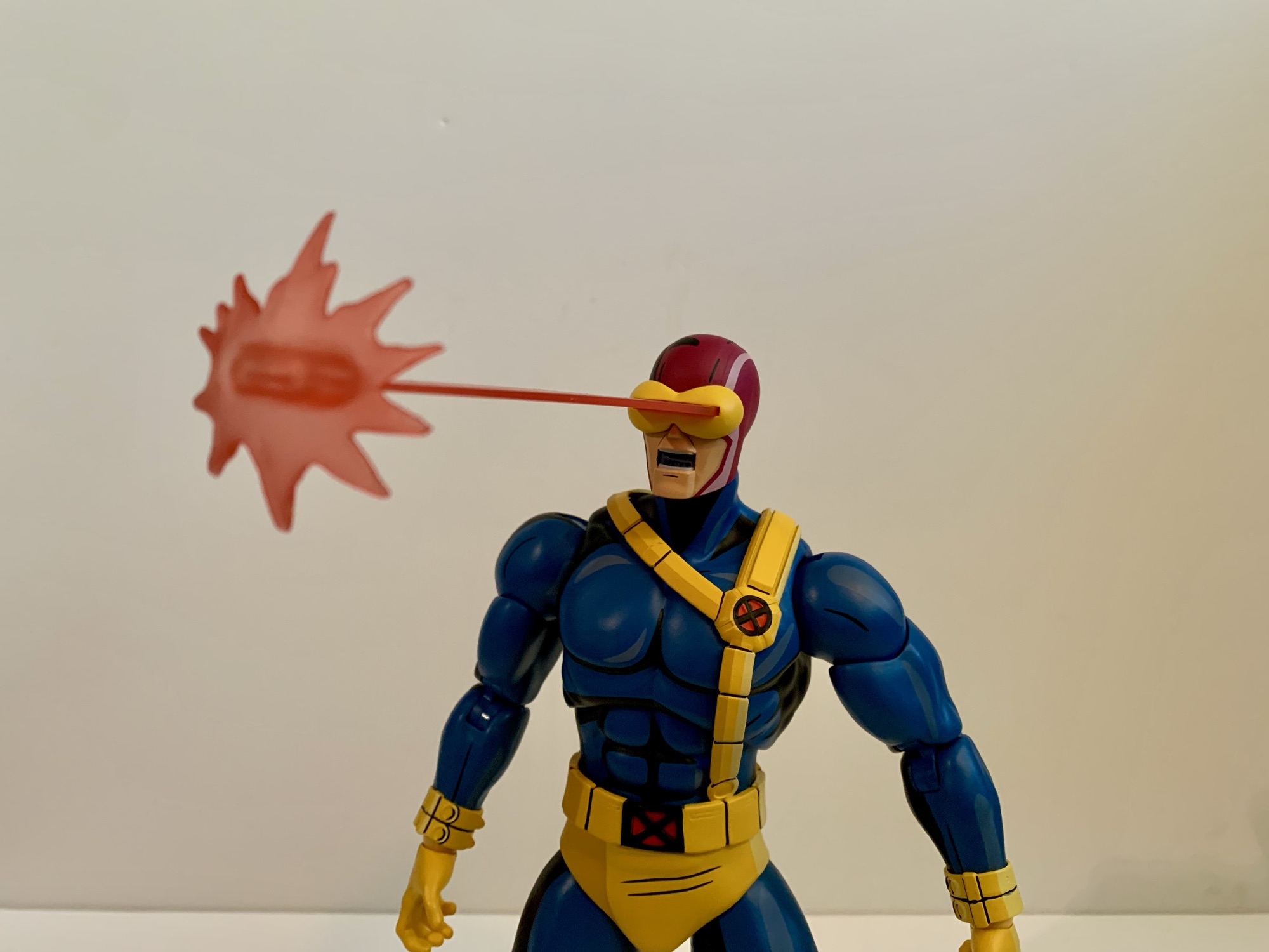Cyclops would wear the jacket in the field plenty, but sometimes also to look more casual. To that end he has an uncowled head. It looks great and his eyes are painted red, which makes sense. Maybe some would have preferred brown eyes for the few times he was depowered in the show, but many won’t display him like that because he also has his shades. They’re black with the red lenses that have some white shading on them which looks nice. They’re a little brittle feeling, but have held up fine so far. They slot into his temples and look great when in place. He also has yet another visor that’s been removed so he can either hold it or stick it around his neck or something. It’s a nice touch. I will say, this head is the most X-Men ’97 looking part of the package, which could be intentional. This version also comes with another effect part that is one, massive, blast that’s almost 8″ long. It has a large splash effect at the end and it looks cool, but it’s heavy. There’s some drooping with this one so I’m reluctant to leave it in place for long stretches of time. It probably works best in tandem with an enemy getting blasted so there’s some added support for it.