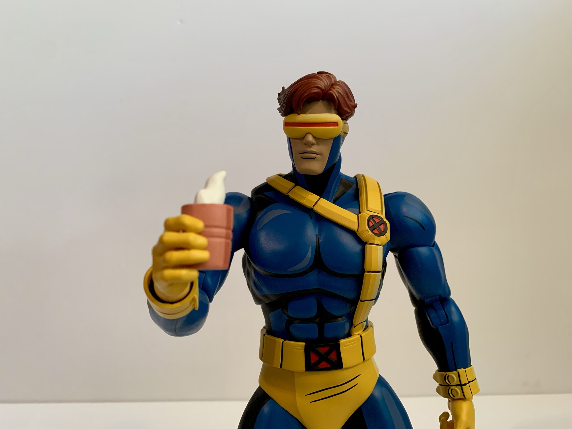 Cyclops also has an assortment of hands to make use of. By default, he comes with a set of fists which are always useful. In addition to that he has two clenching hands, two “finger bang” hands, a set of two-finger hands for his optic blasts, and a single right gripping hand. The gripping hand is for his cup of coffee which is included. This was seen a few times in the first season, most memorably for me in “Deadly Reunions,” and it’s a pink cup with sculpted steam wafting off of it. Even though Mondo included a gripping hand for it, I find the clenching hands work just as well to hold it. Swapping heads and visors is painless with this guy, but the hands are tough. The pegs going into the arms are ribbed when they probably don’t really need to be. The ball hinge also plugs into the hand and each hand is on its own, which is how Mondo always does it. Initially, I felt like the fists were more likely to come off at the hand and not where they’re supposed to in the forearm, so I heated the forearms of my figure with warm water. It’s made easier by the fact that the arms are designed to pop off. I was then able to get the hands out, but it was dicey. I’m reluctant to really jam any of the hands into his forearms as a result, though I haven’t had the same level of difficulty with the other hands.