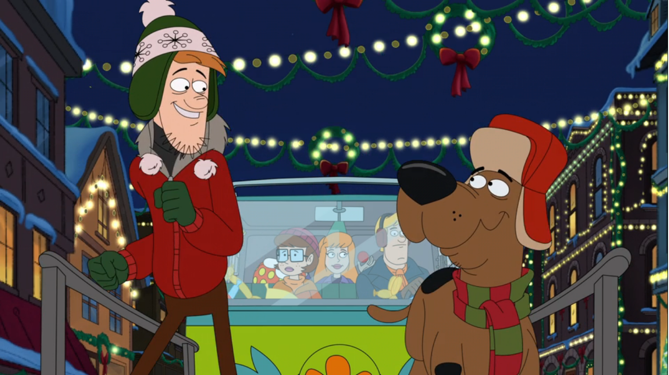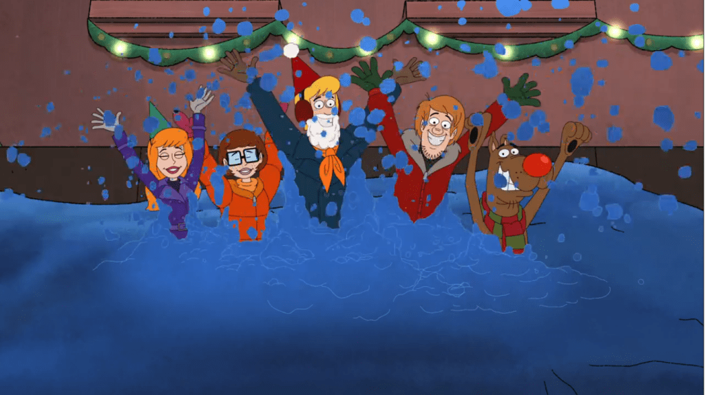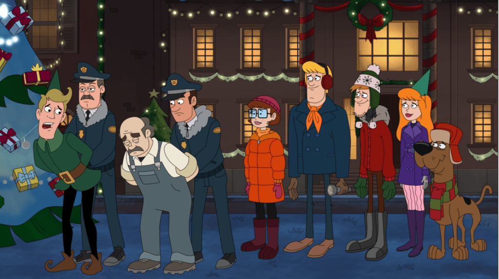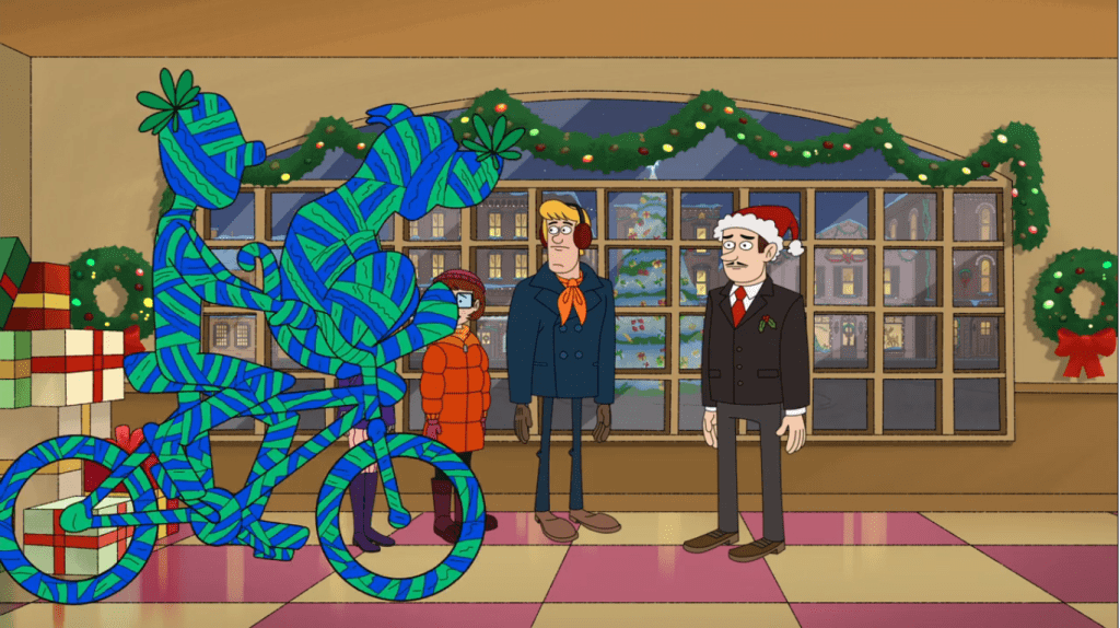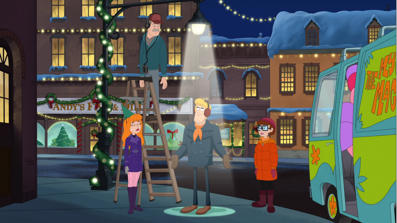 When the song ends we find the gang in Rockwellville which boasts a population of zero naughty individuals and all nice. I’m guessing that sign will be proven wrong before this one is over. Fred (Frank Welker, the only original cast member still at it) and Velma (Kate Micucci) are admiring the scenery while Shaggy (Matthew Lillard) and Scoob (Welker) are doing exercises to keep their metabolism up as they’re in the prime eating season. Fred is very taken by how all-out the town goes for Christmas while Velma seems a bit overwhelmed by it. Fred decides to check on Daphne (Grey Griffen) and see how the decorations in the Mystery Machine are coming along, only when he opens the rear doors to the van, the group is greeted with a “Surprise!” and a face full of confetti. It would seem that Christmas also happens to be Daphne’s birthday and she says she’s always wanted to have a birthday all to herself and not have to share it with Christmas. Velma points out that this means she threw herself a surprise birthday party hoping the others will acknowledge how silly that sounds, but no one does. Fred isn’t really onboard with this decision from Daphne as he’s brought the gang to this festive town in search of the perfect Christmas mystery that will lead to them helping orphans or something. As he explains his reasoning, he’s bathed in a warm light from above which is literally coming from a street light that was just switched on by a fellow named George (Christian Lanz). Fred thanks him and gives him a tip hoping the fellow will return for any other epiphanies he may have.