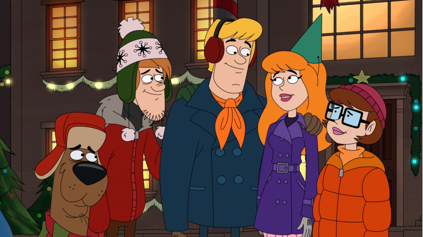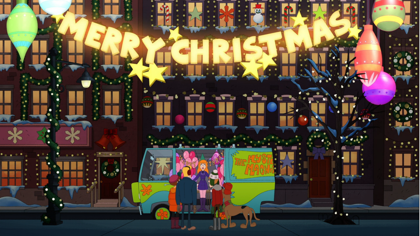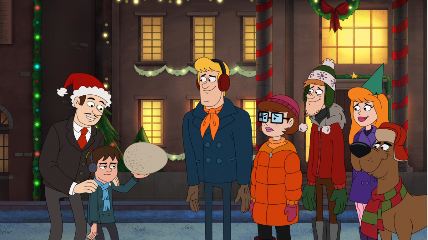 When the song ends we find the gang in Rockwellville which boasts a population of zero naughty individuals and all nice. I’m guessing that sign will be proven wrong before this one is over. Fred (Frank Welker, the only original cast member still at it) and Velma (Kate Micucci) are admiring the scenery while Shaggy (Matthew Lillard) and Scoob (Welker) are doing exercises to keep their metabolism up as they’re in the prime eating season. Fred is very taken by how all-out the town goes for Christmas while Velma seems a bit overwhelmed by it. Fred decides to check on Daphne (Grey Griffen) and see how the decorations in the Mystery Machine are coming along, only when he opens the rear doors to the van, the group is greeted with a “Surprise!” and a face full of confetti. It would seem that Christmas also happens to be Daphne’s birthday and she says she’s always wanted to have a birthday all to herself and not have to share it with Christmas. Velma points out that this means she threw herself a surprise birthday party hoping the others will acknowledge how silly that sounds, but no one does. Fred isn’t really onboard with this decision from Daphne as he’s brought the gang to this festive town in search of the perfect Christmas mystery that will lead to them helping orphans or something. As he explains his reasoning, he’s bathed in a warm light from above which is literally coming from a street light that was just switched on by a fellow named George (Christian Lanz). Fred thanks him and gives him a tip hoping the fellow will return for any other epiphanies he may have.