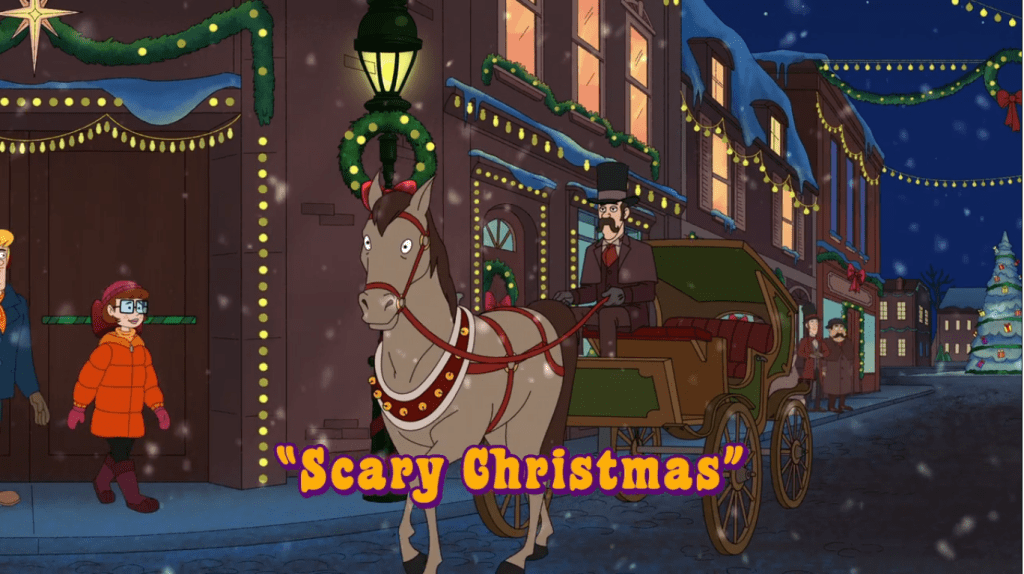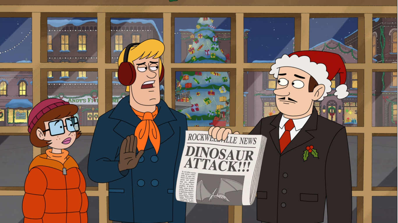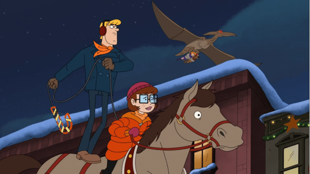Velma points out to Fred that he can’t just choose what kind of mystery falls into their lap, but Fred asks aloud what other mystery could possibly occur in a town as festive as this one? Cue some nearby carolers who sing about the town being terrorized by a giant pterodactyl. Velma seems ready to pounce on this one as she mentions they passed by an archeological site on their way into town, but Fred refuses to believe it. He suspects someone saw a giant reindeer and mistook it for a pterodactyl, but Velma just corrects him and states it was a pterodactyl, but in an excited tone. Fred continues to try and pushback, but Velma just gestures and repeatedly tells him it’s a pterodactyl!