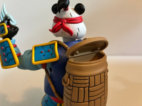 And this brings us to the portion of the review that’s often the least fun to talk about: articulation. I’ve said it before, and I’ll say it again, the NECA toon TMNT toyline is an aesthetics forward line where articulation is not quite an afterthought, but certainly not a priority. Panda Khan for sure embodies this approach as the articulation present is super basic. The double-ball joint at the head allows for swivel and tilt, but no range looking up. Being a tall character, he can at least look down. The ball-hinged shoulders are basic while the pauldrons will impede range going out to the side. They and the other armored pieces do flex, but you probably wouldn’t want to push it and leave them in such a state. The double-jointed elbows are pin-less and the range is quite good, but the joint is not very aesthetically pleasing. There is a bicep swivel, but the range in the arms is not sufficient enough for a two-handed sword pose, unfortunately. The waist twist barely moves while the hips are severely restricted in all directions. The single-jointed knees can swivel, but they don’t bend 90 degrees. He’s one of those characters that also is always semi-crouched as his legs can’t be just straight. The hinge at the ankle is limited while the ankle rocker is fine.