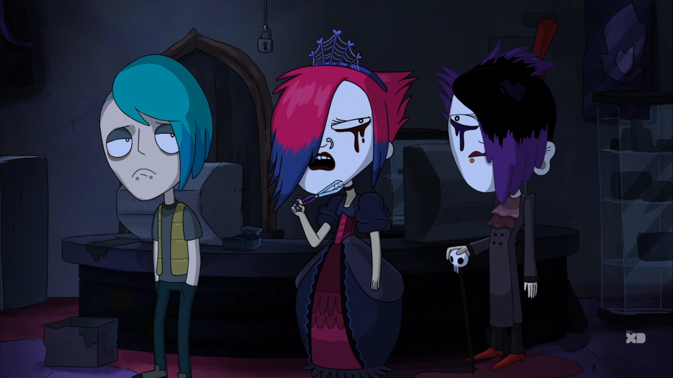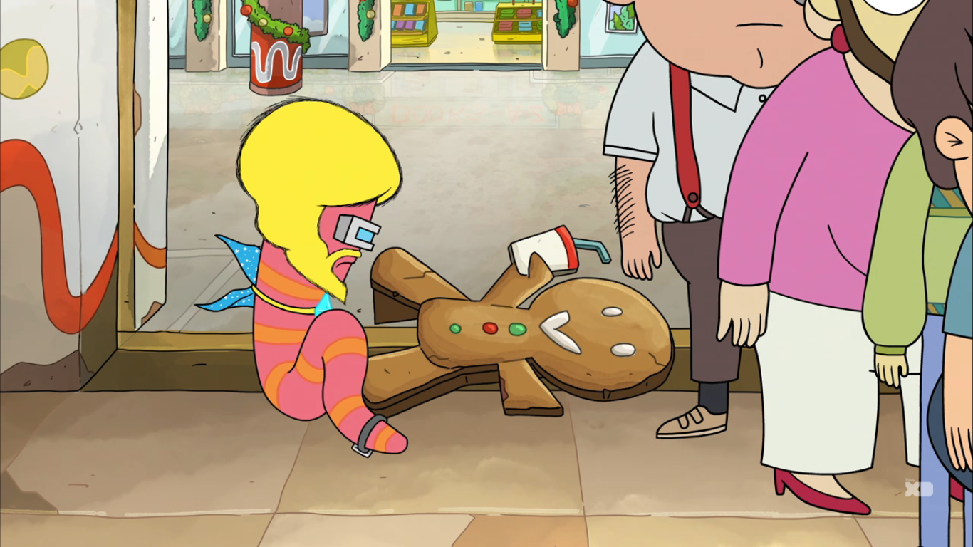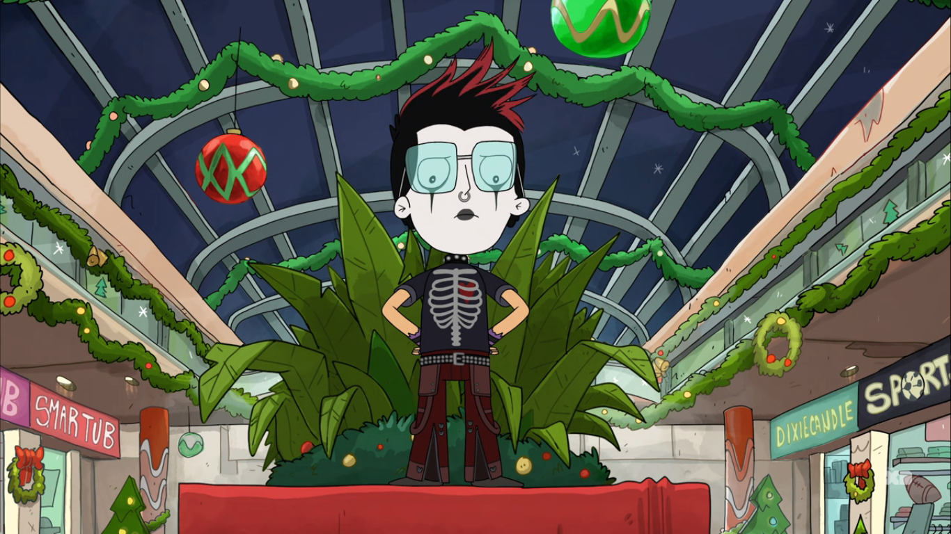 Future-Worm, Danny, and Megan are strolling past the Santa area from the episode’s beginning. Fyootch pauses to regard a standee of a gingerbread man which he strikes down and taunts with the question “Are you bread? Or are you cookie, because you sure aren’t a man!” Danny tells his buddy to essentially knock it off as they need to find his dad, but it turns out his dad has found them. They all gasp when they turn to see Doug, now in full goth regalia. He definitely doesn’t look sure of himself while Megan asks if he pierced his nose. We then hear the voice of the princess girl announce that they sell clip-ons. She and the rest of the squad emerge from the shadows and the princess one adds a “Hi Megan. Thanks for saving my planet. P.S. I work at the mall now.” Apparently, they know each other as Megan refers to her as Ennuisha (see episode “The Forever Five”) and seems genuinely happy to see her again.