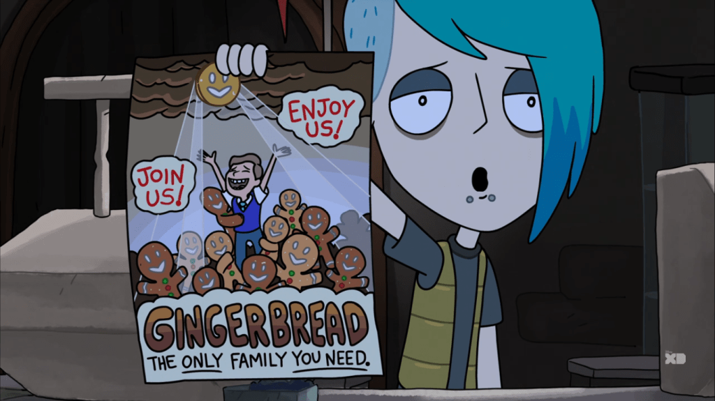 She cackles that she doesn’t need her ex, or anyone, but is interrupted by Ennuisha who points out that she’s doing all of this just because her marriage deteriorated. She relates to the Baroness and apologizes for that happening to her. The Bread Baroness is caught off-guard by this showing of sympathy and tries to dismiss it, but seems genuinely touched. She soon finds her resolve though and vows to carry out her plan to replace families with gingerbread ones so that people can simply eat their families when they get sick of them. Doug then steps up to essentially say “Not today, Bread Baroness!” He explains that families are imperfect, but they still love each other and there’s no replacing one’s family. They all share a hug, and then Doug declares that “It’s time to break bread,” though not with much bravado.