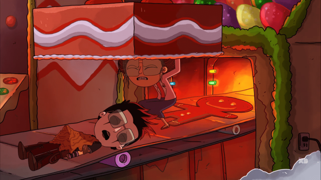 What did work for me was Future-Worm’s disdain for gingerbread. It feels a bit like a Seinfeld routine (“What is the deal with gingerbread? Is it a cookie or a bread?!”), but it works given the character’s preference for peppermint as his chosen holiday spice. I just wish the episode got more out of it. We get the scene at the coffee shop, then it’s reduced to just an occasional quip out of the character. I wanted to see him take charge against the enemies and truly vanquish the gingerbread squad. Instead, the episode wanted to put the focus on the family, which I get, but it’s also not exactly an original conclusion for a Christmas holiday episode. And then to just not even attempt to animate the action part was a cruel joke. Would the censors have not allowed for them to do it justice? If so, then okay, but otherwise that was a cheap cop-out.