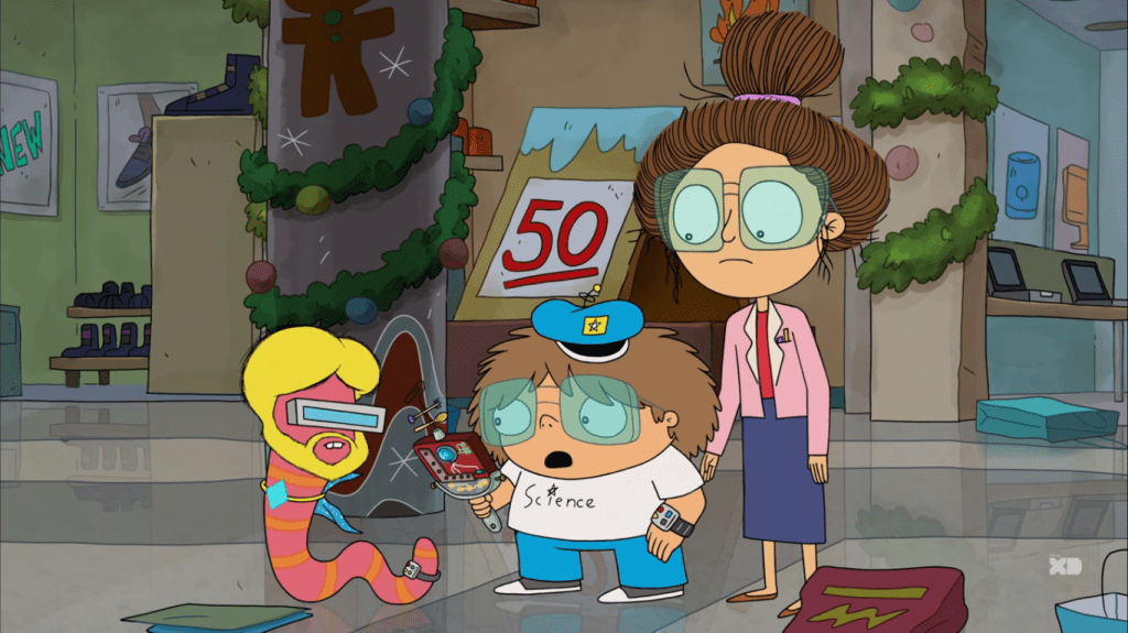 I realize we just did a Christmas post the other day set in a mall, but at least this one is actually set at Christmas! And we’re pivoting from Nicktoons to Disney toons (which surprisingly don’t have their own fun branding) with the short-lived cartoon Future-Worm! I’ll be honest, before doing this post I had never heard of this show. It ran for close to two years (one season plus five shorts) from August 2016 to May of 2018 and is the creation of Ryan Quincy. Quincy is probably best known for his work as an animation director on South Park, a Christmas Spot veteran itself, but has had a few opportunities to oversee his own work. Future-Worm! is an animated show about a boy named Danny (Andy Milonakis) who is something of a genius as he’s able to create a time machine out of an ordinary lunch box. That time machine gets sent into the future and returns with a worm, the titular Future-Worm (James Adomian), or Fyootch for short.
