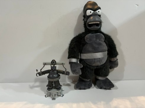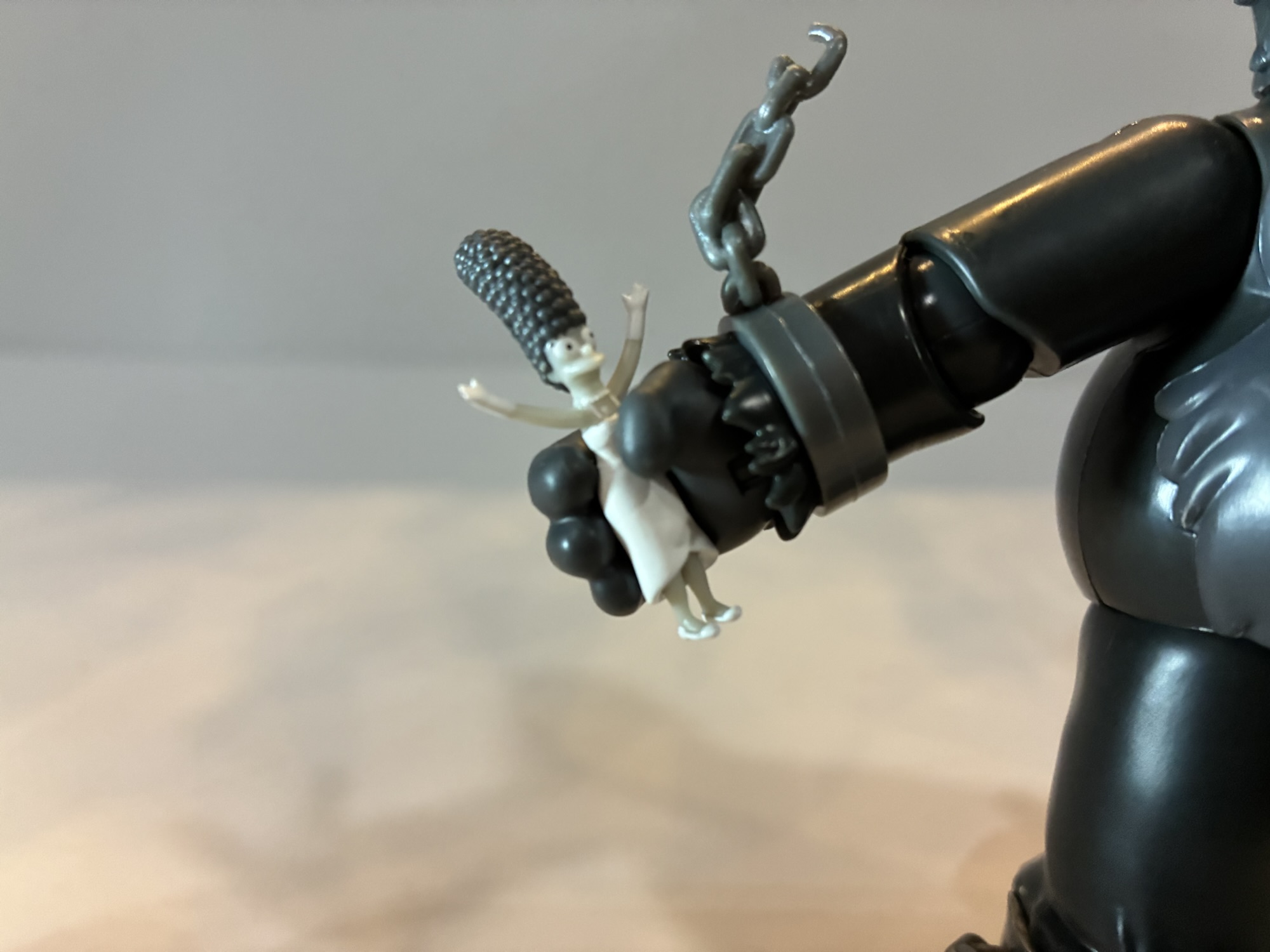 As you could probably surmise just by looking at him, this is essentially King Kong, but Homer. The sculpt is tailored for that look with tufted fur around the ankles, wrists, and the back of the neck. He has ape-like feet with four digits, in keeping things consistent with other Simpsons features, and he even has some sculpted nipples. The figure is molded in the dark gray plastic and the lighter gray as well as the whites are painted features. The only accessories are the platform and tiny Marge. The platform is molded in a very light gray with some painted silver parts that add a little splash to the set. Marge is in her white dress and not in any apparent distress. She’s painted rather well given how small she is and appears to be more or less in scale with Homer.