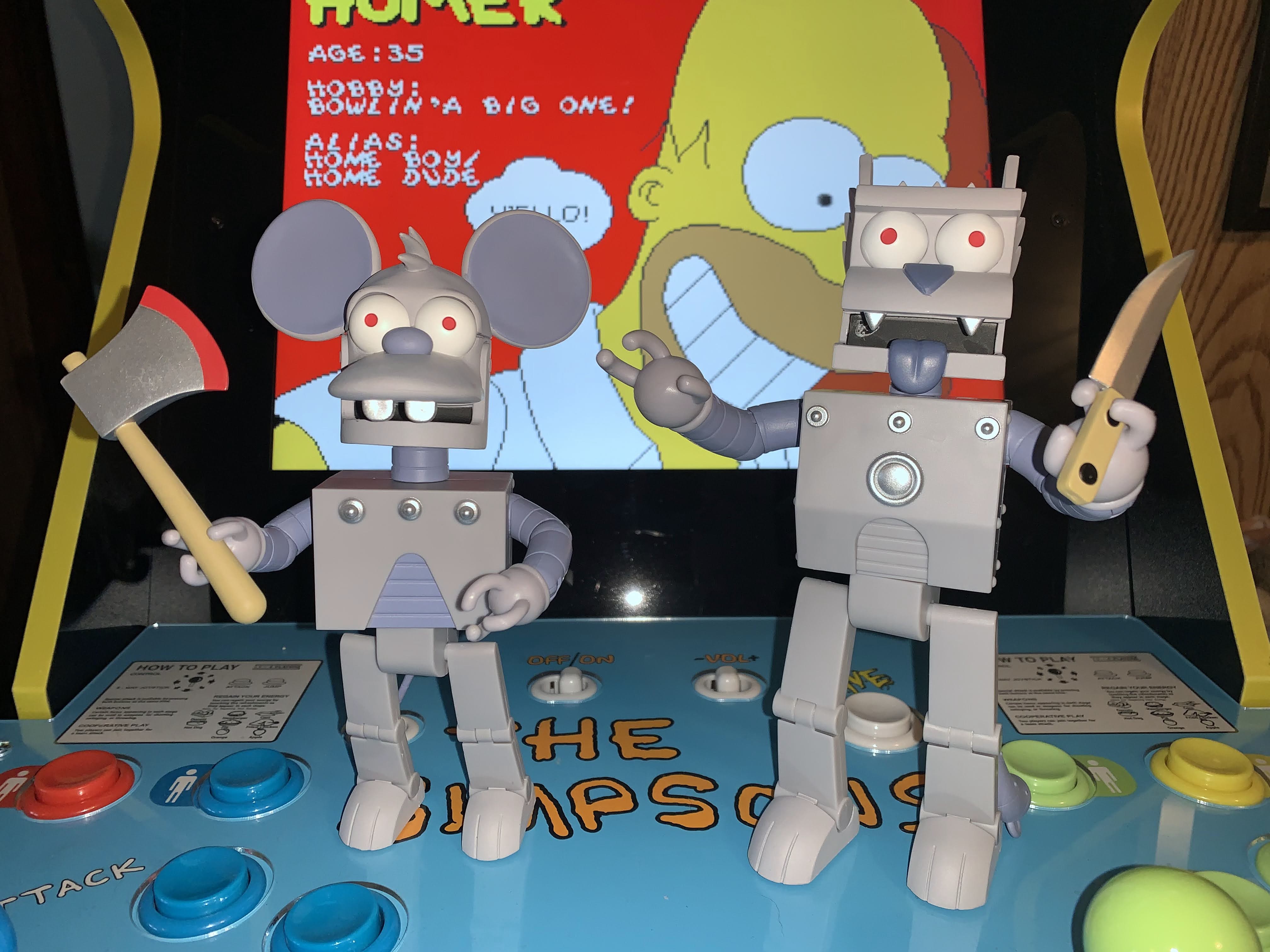 I have two more characters to highlight before we’re done and they come from the 2.5″ line: Itchy and Scratchy. These little guys feel right at home in the smaller scale so much that I don’t think I have any interest in 5″ versions. They have the same limitations as Bart and Lisa which is no elbow articulation, knee, wrist, waist, and their legs move as one piece. Still, the sculpt looks great on both and they actually feature a solid amount of paint. Itchy comes with a club while Scratchy comes with a mallet. The limited articulation means they can’t do much with their accessories, but they look good in a pretty vanilla pose. It would be awesome if at least Scratchy could be pulled apart with gruesome wounds left behind, but Jakks is probably hoping to court some kids with this line so I get why that isn’t the case.