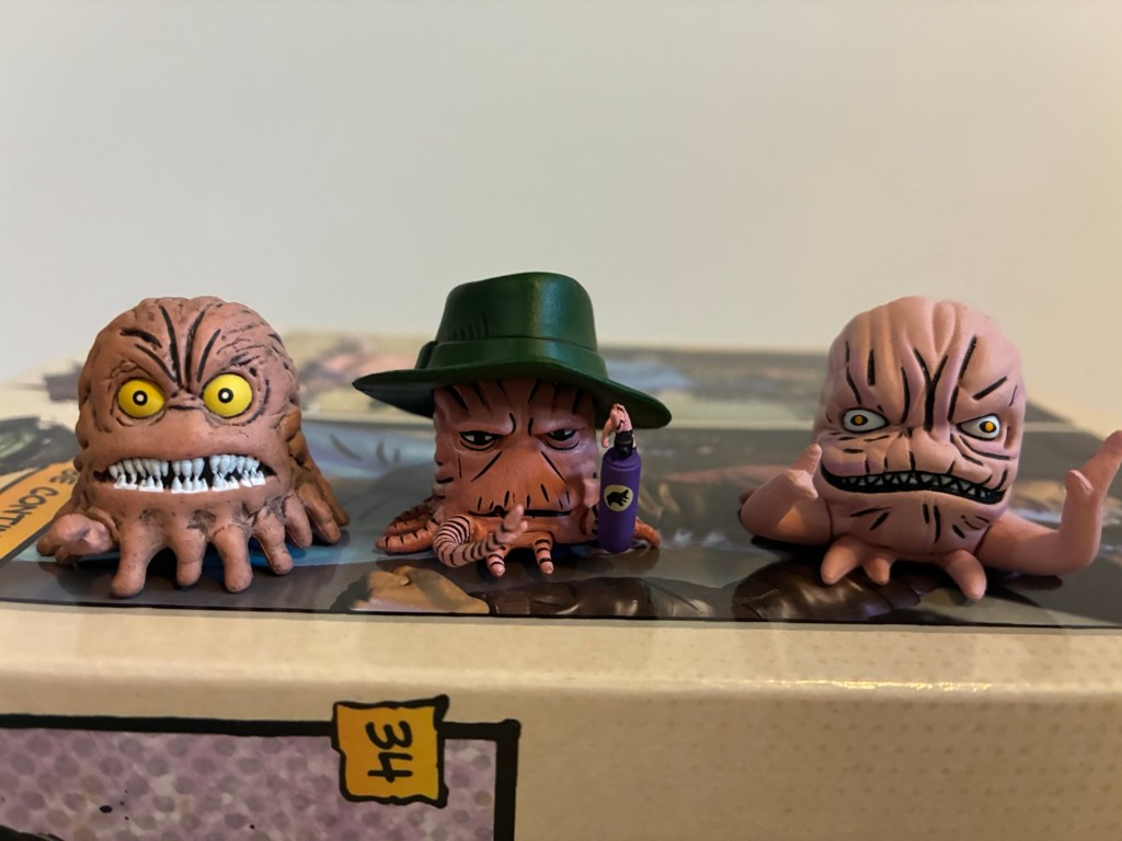 The version of the figure I’m looking at today is the standard colors one. We already have seen two other colorways with the first one being an all red and black edition. I think that one is based on the IDW reissues, but there’s also a black and white one which was released around the same time as this standard one. The standard one follows the basic Foot coloring with a brownish-red tunic, gray pants, and brown wraps on the forearms and shins. There’s a big brown sash across the midsection and from the hat drapes a red hood of sorts that leaves the face visible. For the face, we have the faceguard which is done in silver and the flesh is painted all in shadow with two, beady, white eyes peering through. The hat can be removed and the red hood is attached to it. Doing so reveals a somewhat comically small head, but if the head was made any bigger it would probably look a little too big with the added hood. Plus, it’s not meant to be displayed without the hat since it leaves a big peg hole in the top of the head sort of like a Lego mini figure.
