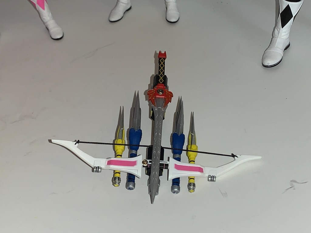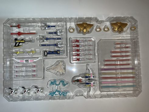 For Trini the Yellow Ranger, she has her daggers which also resemble sai. Again, they’re well painted and do what they’re supposed to, and unlike the other weapons so far, the size seems fine. Zack’s power axe also looks great and has a sliding handle so it can be wielded like a pump shotgun. Sizing for it seems fine and it can make use of the blast effects included. Kimberly has her bow (I guess power bow?) which also has a real string affixed to it which is stretchy. She has three arrows as well to wield and the weapon works well enough, though it’s always a challenge to get an action figure to pull off a bow look and she’s no exception. Also included are some optional weapons. For Billy, we get the Anti-Sonic Foam Gun which looks like an old Nerf double ball blaster, but painted blue. There’s a non zero chance that’s what the actual prop was. It has an optional effect part if you want Billy spraying foam on your shelf. I’m not sure that I do. There’s also three Thunder Slingers which are basically handheld slingshots, but made to look like something a Power Ranger would handle. They look great, but this is more stuff I’m likely to just look at once and then put away forever. And if you’re curious, yes, there were five of these in the show, but Mezco only provided three. I think they could also combine with the Blade Blaster, but no such functionality exists here.