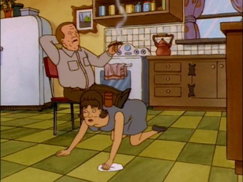 The next morning, Hank is getting what looks like a leftover pork chop out of the fridge while proudly telling Peggy how tough he had to be with Bill. Peggy actually seems worried about Bill, but Hank is not since he asked him twice if he was okay. He then sees Lenore just hanging out on top of the fridge and, rather calmly, just notes it. He brings Lenore over to Bill’s house and lets himself in. As he walks into the kitchen he puts Lenore down for he spies a woman hanging clothes in Bill’s backyard. He angrily goes out the slider and demands to know what she’s doing in Bill’s backyard, but a very, bad, female voice returns “Why Hank? Don’t you recognize me? I’m Lenore!” She turns around and we see that it’s Bill in a long dress and woman’s hat. She (he?) adds that she’s just washing her dress for Hank’s big party which causes Hank to gasp, yet again.