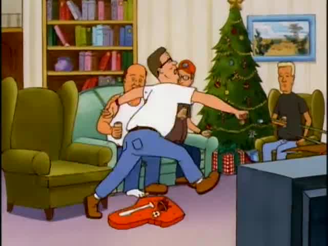 The episode begins with the usual suspects standing in the alley drinking a beer. Hank, Bill, Dale, and Boomhauer look as they do so often in the show, and then Bill just starts sobbing. As he cries, a very jolly, instrumental, rendition of “Sleigh Ride” comes in as Bill continues to sob and his friends continue to ignore him by just staring blankly straight-ahead. This smashes to the intro and when that ends we go right back to the alley. Bill gets ahold of himself and very plainly remarks, “I love Christmas.” Then he continues with the sobbing and we find out that it was at Christmas time his wife, Lenore, left him. He tries to convince himself it was the best thing that ever happened to him, but he just goes back to sobbing. Bill heads home leaving the others behind. Hank (Mike Judge), being the better friend of the three, remarks out loud that he’d like a cookie and can always count on Bill to have cookies in his house. This is his cover to go check on Bill because these men could never admit to one another that they care about each other.