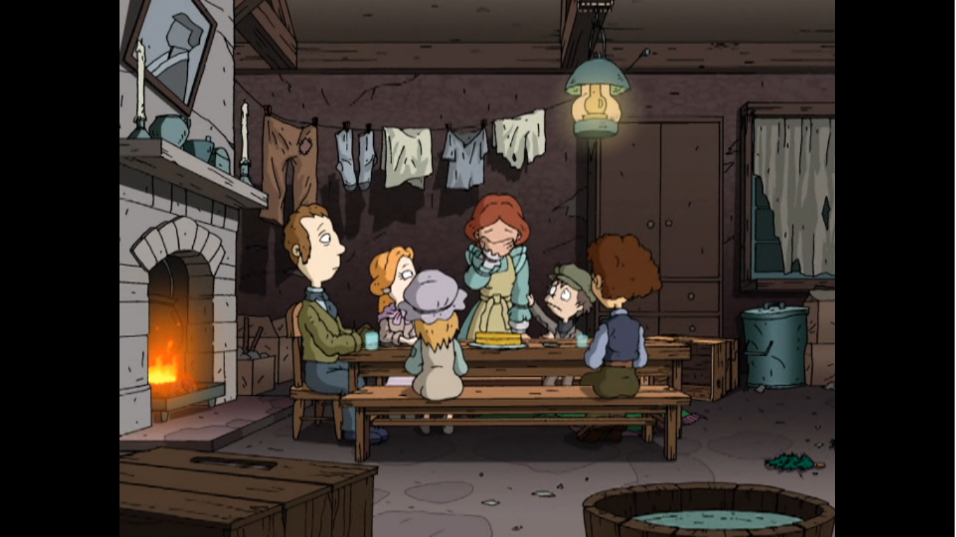Free from the net, Krumm simply thanks Oblina while Ickis starts wailing about how he could have been severely hurt. Oblina is not interested in his complaints at this point and tells him he was safer in that plane than he is now. Ickis replies with an, “Oh really?!” and appears poised to go on a rant, but is soon flattened by the dog-pulled sleigh to which Krumm can only remark “Bummer,” at the sight of his flattened friend.