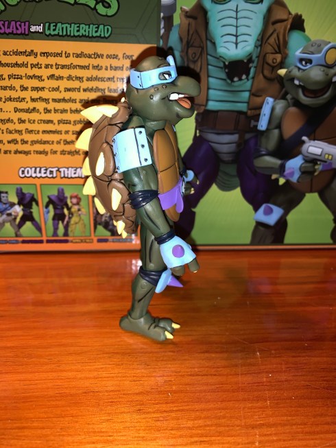 Leatherhead stands at right around 6.25″ to the top of his head. This is a much shorter, squatter, Leatherhead than we’re used to seeing. The toon Leatherhead, by comparison, is around 7″ tall. This guy is really not much taller than the turtles with only a little more girth. Again, I don’t have comics to compare so I’m just going to assume that NECA got it right when it comes to scale for the Archie line. His attire is pretty simple compared with his usual getup. We have just some purple trunks with white stripes and wrestling boots that are in the same style as what we saw with Cryin’ Houn’. The exposed flesh is all textured with lots of little bumps and such and like most Leatherhead figures the tail comes detached in the box.