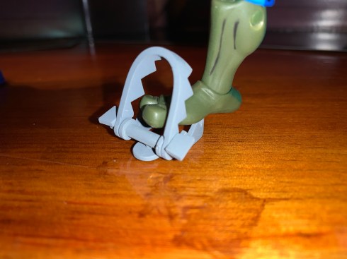 Articulation for Leatherhead is not particularly impressive, though it’s not really a strength of the line either. He does have a double-ball peg for the head, but since it sits so low on the chest there’s not a lot he can do with it. He can look side to side okay as well as down. There’s a little range looking up, but the head has a tendency to pop off of the ball peg when doing so. The mouth does open and close which helps to make the figure a bit more expressive. Shoulders are simple ball hinges which rotate fine, but can’t quite raise out to a “T” pose or come all the way down at the sides of the figure. There is a biceps swivel as well as a swivel and single hinge at the elbow. Leatherhead can straighten his arms out there and just about hit a 90 degree bend. Wrists swivel and hinge horizontally.