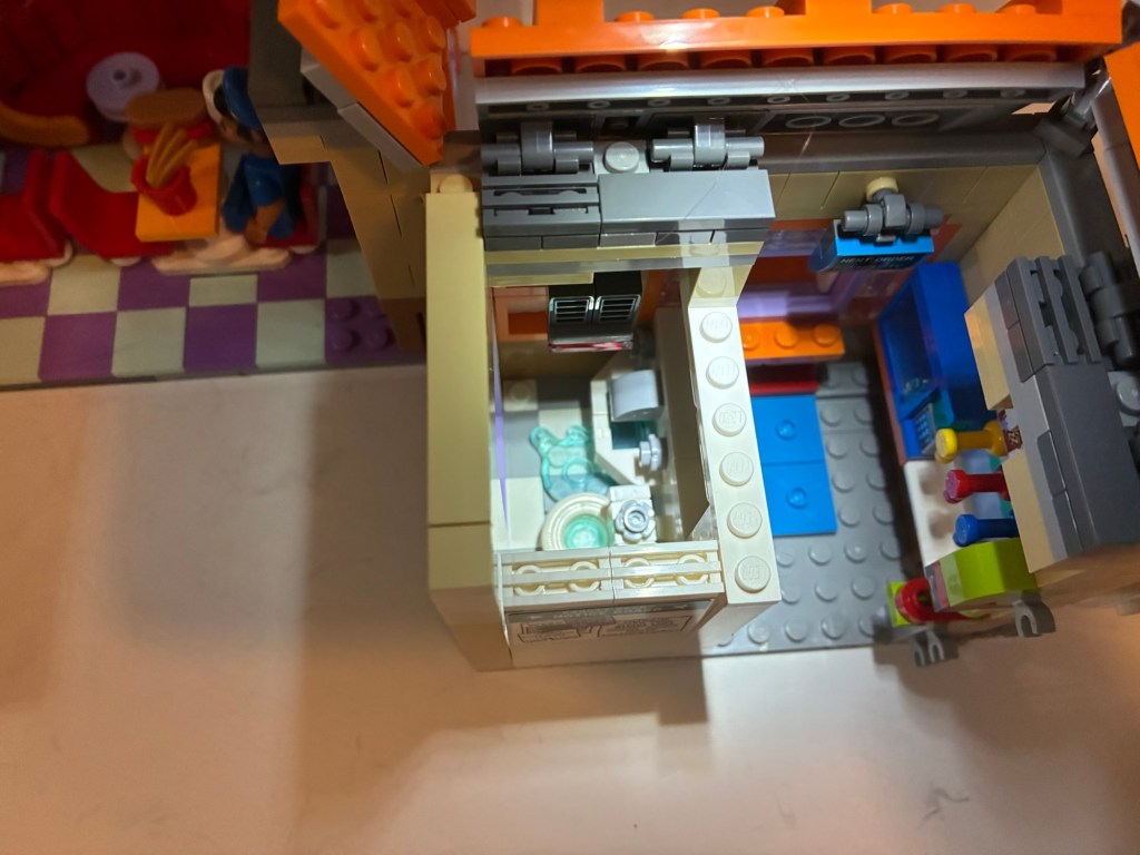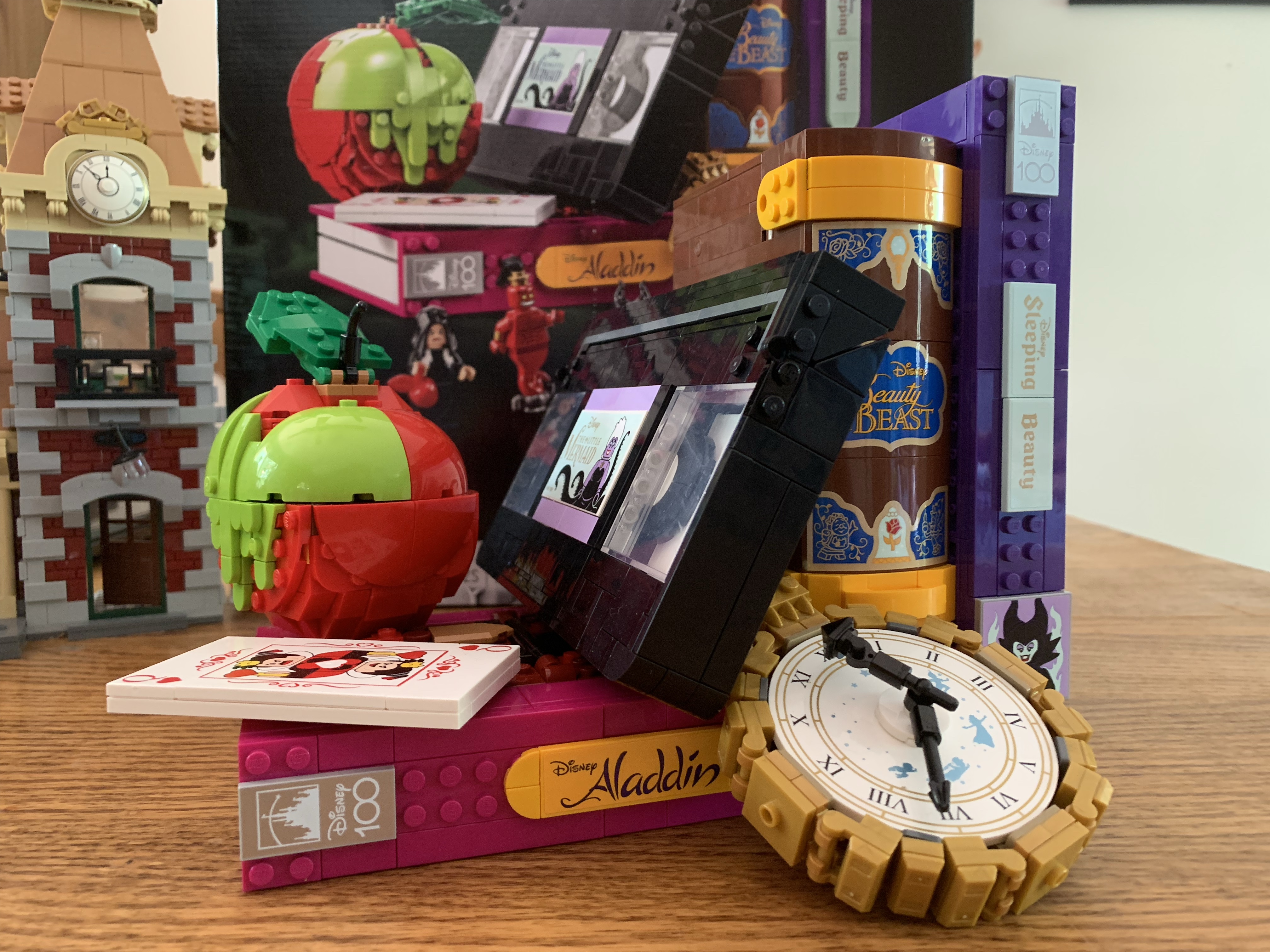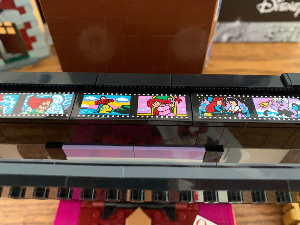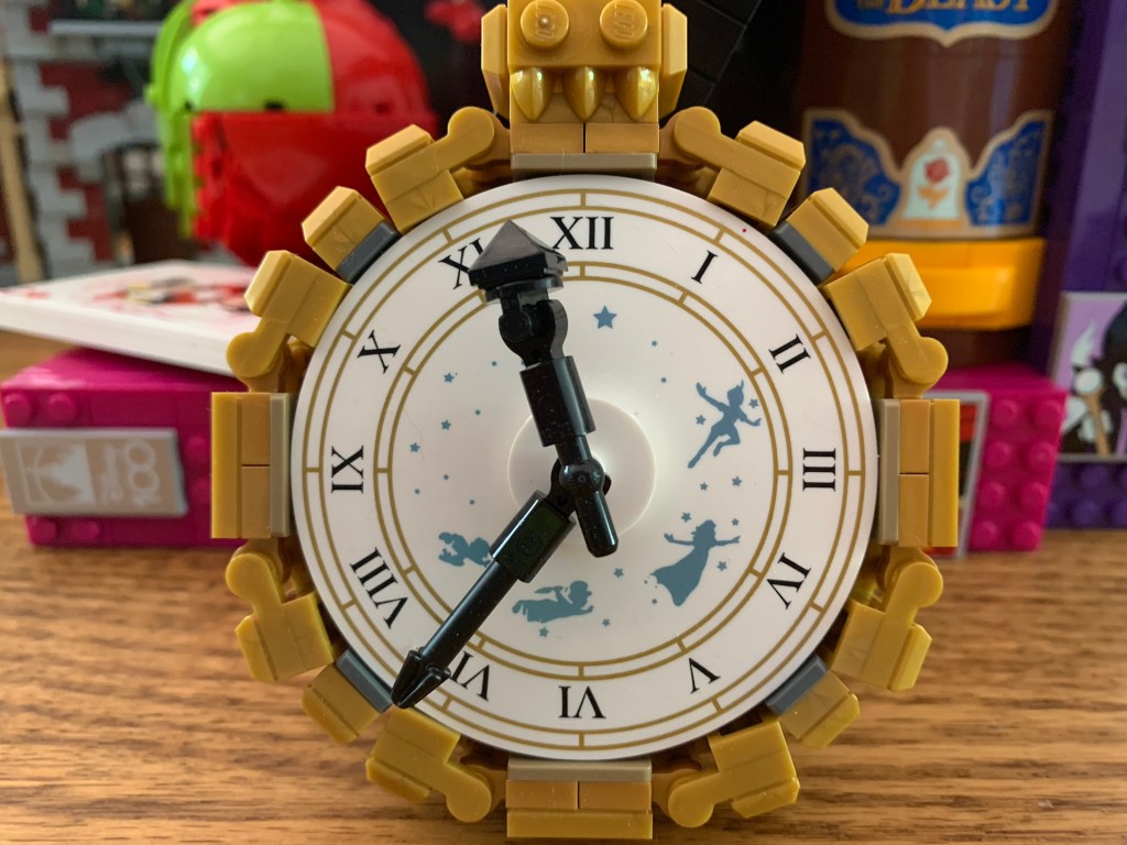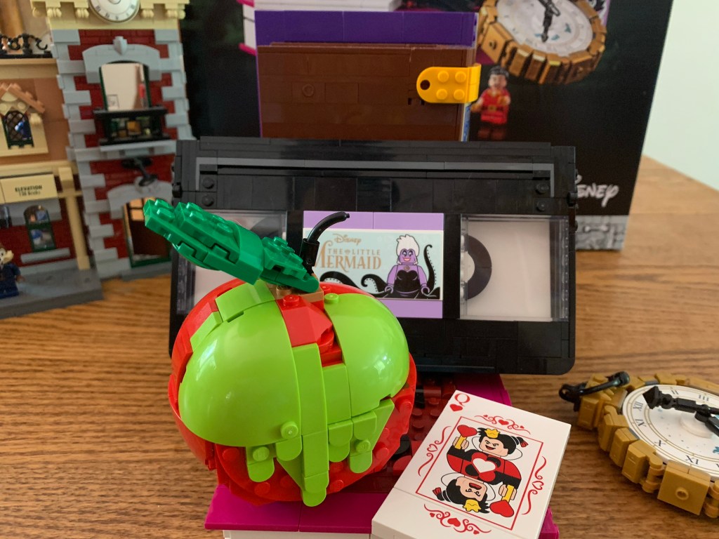 Like the castle, the station is essentially a façade with an open back. Lego could have set it up on a hinge, but it opted not to. It’s fine and actually makes it easier to place on a shelf or something. I suppose if you have this on a large surface with the track going around the station it might bug you that it doesn’t have a back, but if it did you wouldn’t be able to see the lovely interior. Since the building itself isn’t particularly large, there isn’t nearly as much “fun” inside as there was with the castle, but what’s there looks nice. There’s a ticket counter with a bench in the main section and a luggage scale tucked away as well. There’s a pair of scaled-down replicas of the locomotive and a little lounge on the second floor. The clock tower is the only area on what is basically the third floor. An architect might complain there’s no way for the characters to physically move from floor to floor, but I like that they didn’t cram stairs into this thing. The windows in the hall look nice and I like the red curtains. Having never been inside the actual station, I can’t really attest to the authenticity, but this looks fine. The only thing missing is a bunch of fun easter eggs referencing past Disney films and cartoons like the castle possessed. There’s a cute replica of the Lego Cinderella’s Castle and box for the third floor and a pink umbrella that might be a reference to Mary Poppins, but otherwise I didn’t notice anything obvious.