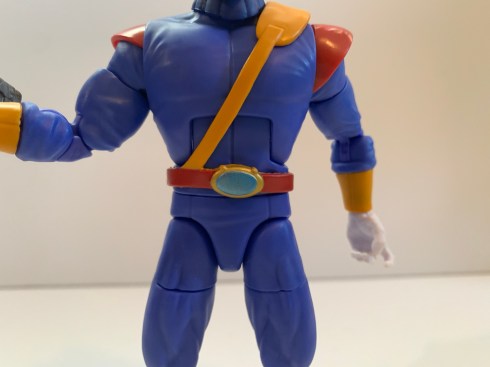 The rest of the body is essentially bare plastic. I don’t think there’s another hit of paint on this guy. The only painted part is the belt. Since it has a shoulder strap, Hasbro did it all in one piece. It’s an orange plastic which matches the cuffs on his sleeves. The actual belt portion is painted red and the device on his belt buckle is painted gold and green. It’s somewhat soft, but the choice to make it all one piece means you’ll likely have to mess with it to get it on straight. The harness is pretty tight with no real room for play so it tends to want to pull up on the belt. It’s really challenging to get that belt buckle centered, if not impossible, so it may drive some folks a little nuts if they hate stuff like that. I wish they had just done it in two pieces similar to what they did with the strap on Cyclops. His shoulder pads are also a softer plastic that are keyed into the shoulder joint. I’m guessing the peg for the arm goes through a loop to sort of hold it in place. It moves with the arm, but getting them to mirror each other is a chore. The shoulder pad on the right shoulder of mine is seated nicely into the body while the left one is not so more of it is visible. In trying to jam it back in I actually damaged it slightly with my thumbnail so I guess I should learn to live with it.