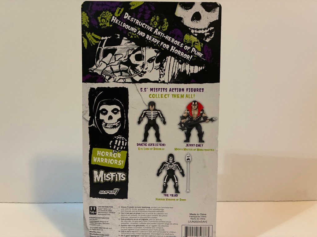 If you have the Danzig figures or read my review, then you know what to expect with these ones. The figures come on a blister card designed to mimic the MOTU cards they’re inspired by. The dimensions are even the same as the current MOTU Origins packaging. The cardback depicts an explosion of skulls on a neon green which is very Skeletor-like while the card bubble is in the shape of the Fiend’s visage. The rear features some artwork from the Die, Die My Darling single and a cross-sell that only includes these Misfits figures. It does not include the Danzig ones and I guess that’s because we’re dealing with two copyrights. The Danzig figures were licensed through Glenn’s evilive imprint while these are through the new entity, Misfits AD, referring to The Original Misfits which is shared by Jerry and Glenn. I thought maybe Jerry’s would just be through him, but I guess not. Both of their websites are referenced on the box. There was some weird hang-up with the Danzig figures from Super7 and I don’t know if it had anything to do with the legal stuff or if it was an approval thing. This Danzig, as well as the other two, were cancelled at one point while Jerry and the Fiend were not. Whatever the issue, it was resolved and they’re all here now.