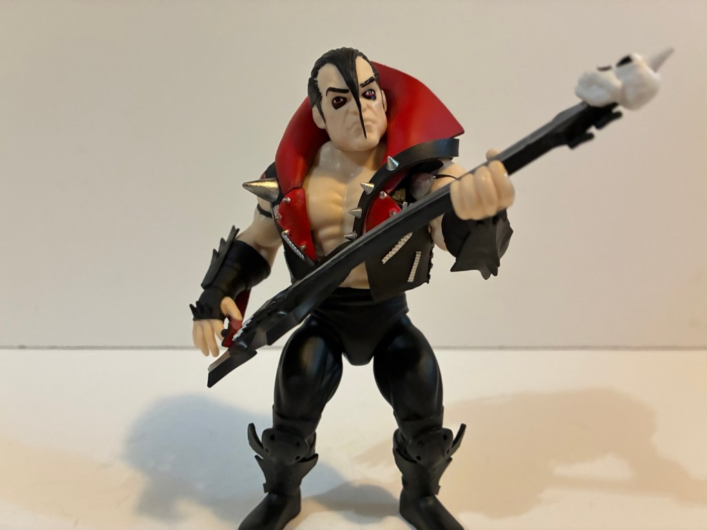 Jerry is the most involved of the group from a sculpt and paint angle. He’s depicted in his current stage outfit which features a black, spiked, vest trimmed with red and The Fiend behind the collar. The paint is just okay on the vest as there’s some red on the back of the collar and some other slop in places. The profile looks pretty good and they got the little hit of red under the eyes mixed in with the black. Super7 was pretty kind to Jerry’s receding hairline and the devilock comes down over the nose and mouth. The arms and legs are both unique to Jerry as he has his big gauntlets and his unique boots which also have a relief of The Fiend sculpted on. Jerry does come with his bass which looks pretty good. The paint on the strings isn’t very clean, but the cyclops skull at the head of the neck looks okay. The strap is covered with spikes which are legitimately pointy. The outside is black while the inside is painted red. Jerry’s left hand is positioned so he can hold the neck while the right hand is flat like he’s slapping his bass. I don’t think he plays like that, but it’s fine. It’s a little tricky getting his hands over the strings so it’s probably easier to pose him with his right hand up like he’s getting ready to smack the hell out of that thing.