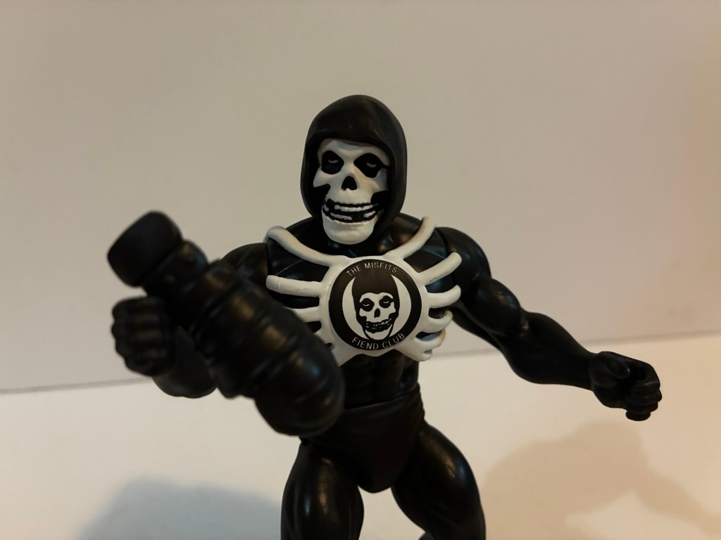 The Fiend is an interesting inclusion, but not unwelcomed. He features a unique, hooded, head and his skull face is painted white. It’s quite clean and I like the black and white approach to the figure. The torso is a blank done on black plastic while the legs are the same as Glenn’s only his buckles are left bare like the Samhain figure. Distinguishing him from the others is this wrap-around skeletal armor with the Fiend Club logo stamped on the front. It carries onto the back which is nice and it’s glued in so you can’t remove it without some hassle. Interestingly, all of the promo shots of the figure featured the skeletal-printed arms that Glenn has plus paint on the legs, but the final edition is bare. For accessories, The Fiend has some catcher’s equipment on his right forearm which is something Glenn used to wear as part of his stage getup. It is removable so if you want to swap it with Glenn you can. He also has his own take on Skeletor’s Havok staff only this one is topped with a jack-o-lantern that’s based on the Halloween single artwork. It’s black and white as well as it’s done on white with black, painted, features. The paint isn’t as clean, but in terms of accessories it feels appropriate.