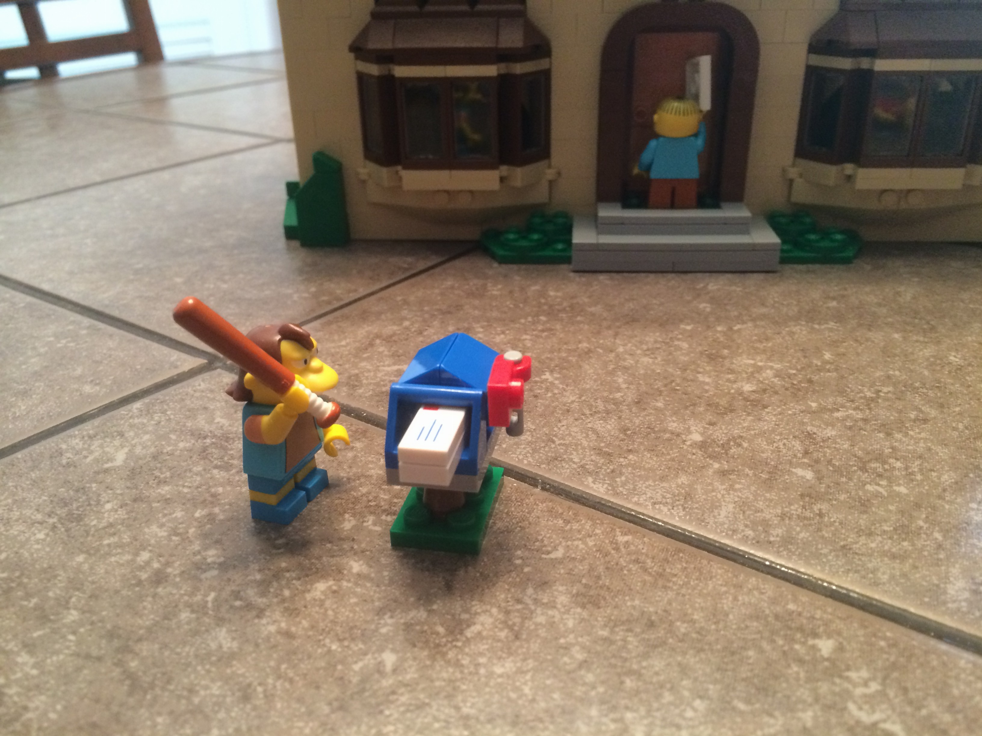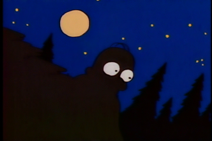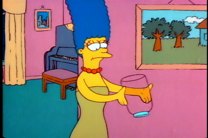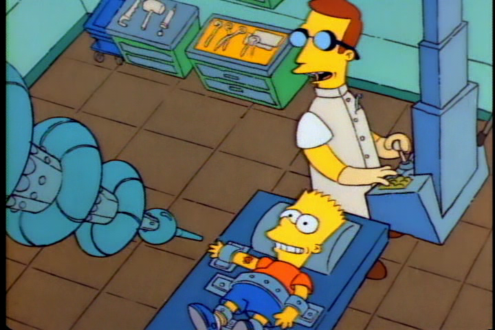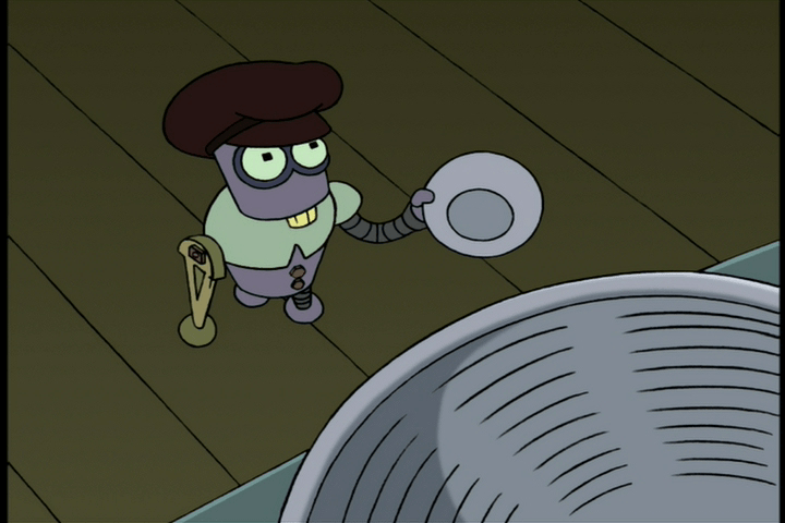 His next stop sees him popping out of the chimney to a well-lit room which startles him. It’s the home of the, shall we say, loose old lady character? She (MacNeille) is perched in a doorway rather seductively, though her charms are unlikely to affect Bender. She saunters over to the mechanical man and offers him a cookie from her cookie jar. Bender is receptive to the idea and sticks his hand in only for an old-fashioned mouse trap to snap across his fingers. As he regals the trap, he asks “What’s in these things?” The old lady them suggests he slip into something…fiery, and she pulls out a flamethrower and lights him up. Poor Bender is then shown emerging from the chimney charred and broken.