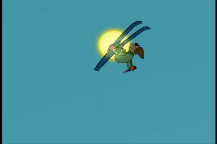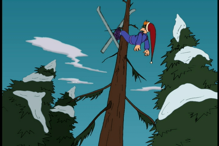 Because Santa had a head built with paradox absorbing crumple zones – that’s why! A new head just pops up to take the old one’s place forcing Fry and Leela to bail. Bender, because he was covering his ears, is a bit slow to pick up on what’s going on, but upon seeing Santa pointing his massive bazooka his way he gets the right idea to run. Santa fires as the trio duck into an elevator and the doors close right on the missile. It’s stuck there, blinking and beeping, while the elevator goes down. The tip of the warhead gets cut off, but we soon see Fry, Bender, and Leela emerging from the elevator at the base of the mountain, only Leela is carrying the explosive for some reason. She pauses, remarks “Wait! This is what we’re running from!” then tosses it back into the elevator. Fry hops onto a toboggan with Bender behind and Leela in the rear. They just sit in place with Fry shouting “Faster! Faster!” The bomb in the elevator then explodes and the force of the explosion sends the crew shooting down the mountainside.