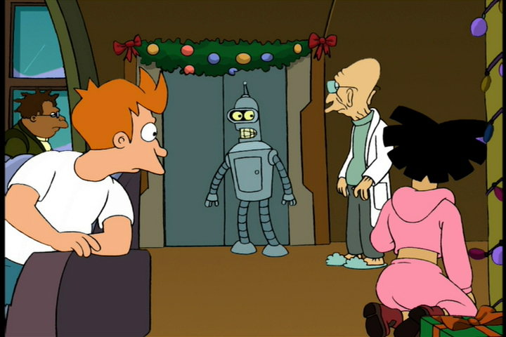 It’s now time to hear a holiday message from the head of Walter Cronkite (Frank Welker). He is here to offer up a warning about Santa Claus. As he details the danger this menace presents, we’re treated to images of the robot’s exploits from the prior episode. The message is concluded with Cronkite telling the viewer, “Remember, I told you so.” And as he finishes, the screen gets covered by planks of wood. Hermes (Phil LaMarr) is apparently pretty frightened by the prospect of Santa to the point where he feels the need to cover the television. Fry is fine with it since he’s tired of this wood show. We cut to the crew trying in vain to install the fireplace cover to keep Santa at bay. The Professor (West) is there to scold them for taking too long saying he only has a few years left to live and doesn’t want to spend them dead! Leela (Katey Sagal) encourages Fry and Bender (John DiMaggio) to push harder prompting Bender to say, “Oh? Push!” Once the robot is pushing instead of pulling the giant shield slams into place causing Fry and Leela to get tossed aside.