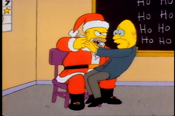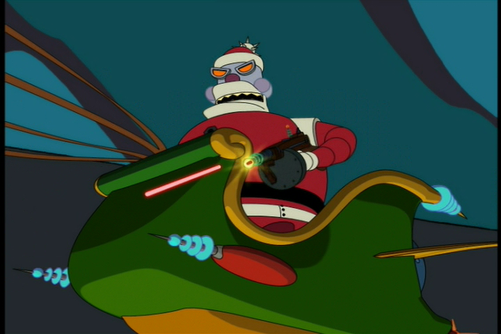The random number generator then hits zero and the mayor gleefully throws the switch. Bender immediately feels the effects of the magnets, which as you may or may not know, causes Bender to sing folk songs, “Swing low sweet chariot coming forth to carry me home!” Fry can’t bare to see Bender suffer, while the Professor happily points out that at least it’s not boring! At that moment, the real Santa finally comes crashing through the wall in his sleigh. Doing so destroys one of the gigantic magnets though Bender still appears to be in some distress since he is attached to the board he’s on. Santa also has his hat back, so I guess he found a spare somewhere. Santa opens fire on everyone in the room and destroys the other magnet. The mayor cries out to Jesus for help, but Zoidberg informs him that he helps those who help themselves and then makes a retreat.