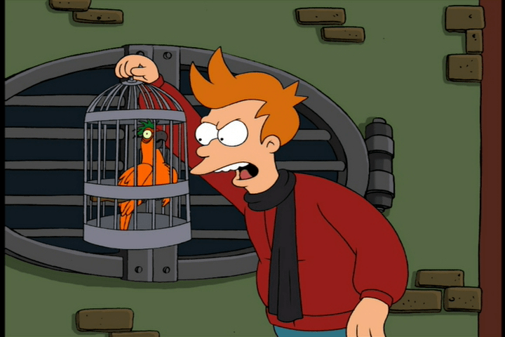 Judge Whitey gavels the room to get the Hyper-Chicken to stop freaking out over imaginary badgers. He’s apparently heard enough as he tells everyone in the court he has a ham dinner with mayonnaise waiting for him back at his mansion, so he finds Bender guilty. He sentences him to death which will take place at sundown (wow, the future moves fast). Bender is lead out in handcuffs while Leela is left to remark she hopes that dumb chicken feels bad about what he’s done. We cut to the chicken at the top of the courthouse crowing to the heavens.